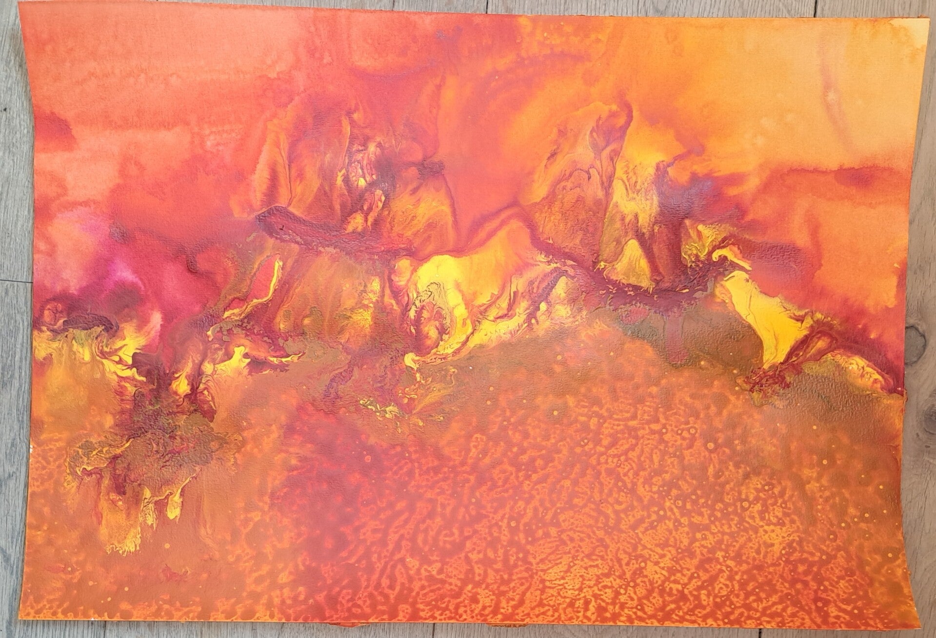 Vloeibare acryl Inkt op acrylbasis (Golden high flow acrylics) op papier ('Aquarelle' 225 g/m2) met de kwast opgebracht.