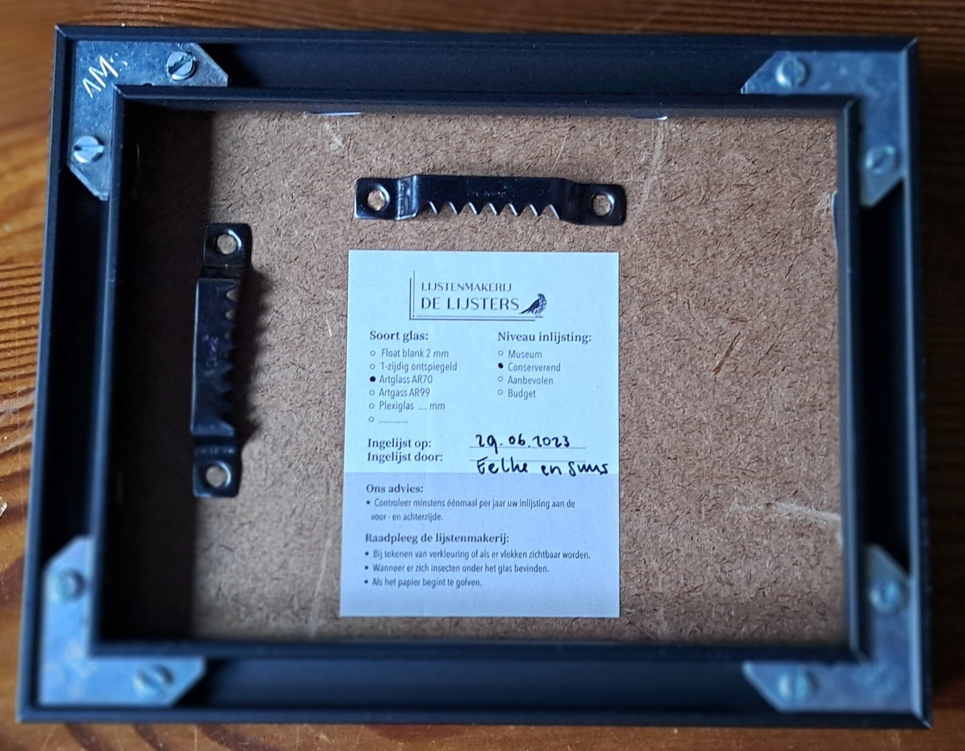 Ingelijst. Inlijstwerk: lijstermakerij 'De Lijsters' (Utrecht) met 'Artglass' AR70, niveau 'Conserverend'. Lijst en passe-partou zijn zwart.