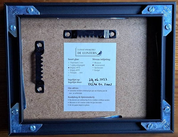 Ingelijst. Inlijstwerk: lijstermakerij 'De Lijsters' (Utrecht) met 'Artglass' AR70, niveau 'Conserverend'. Lijst en passe-partou zijn zwart.