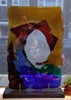 Scherven glas worden in 3, 4 soms 5 of 6 lagen als een mozaïek op een transperante ondergrond gelegd. (Vandaar ook dikte verschillen in het uiteindelijk werk) Er is gewerkt met Bullseye Glass. Formaat uiteindelijk werk ca. 54x34x0,5 cm. op hardstenen standaard 40x12x3 cm. Gewicht glas (exclusief sokkel) ca. 4600 gram
