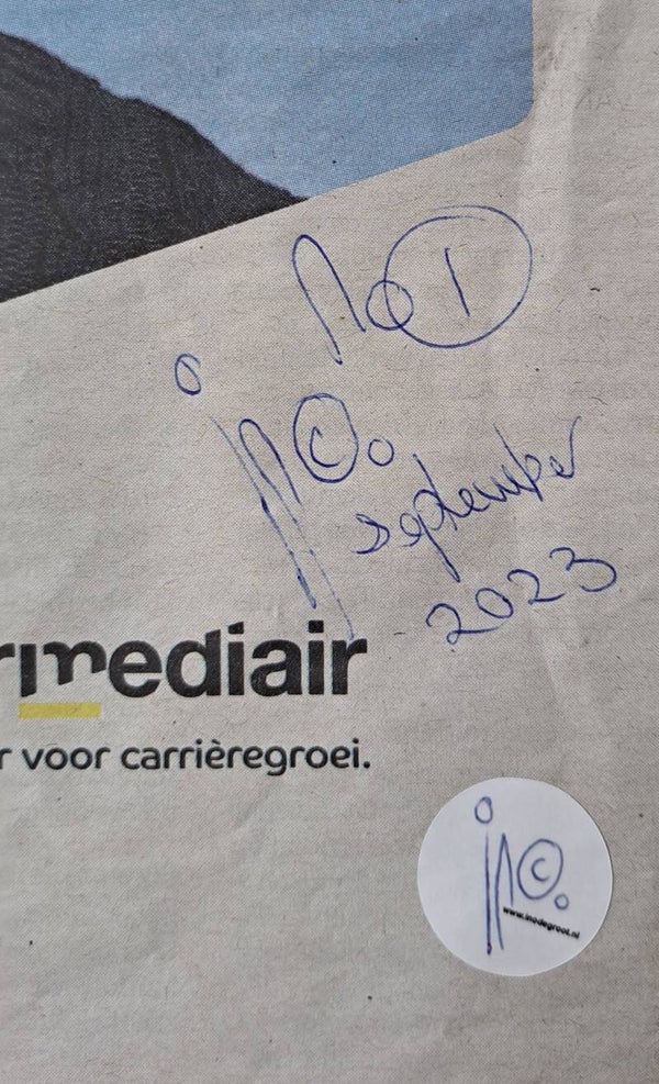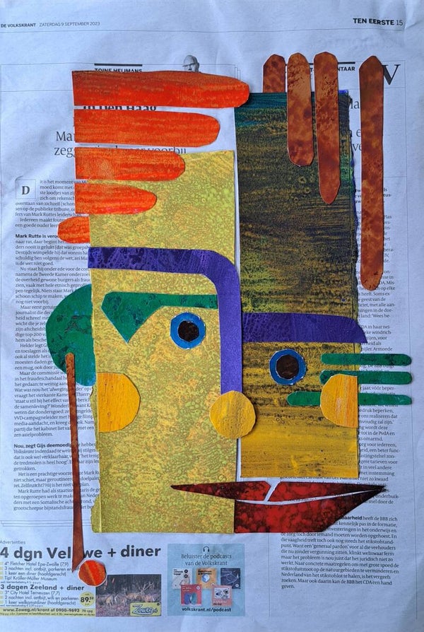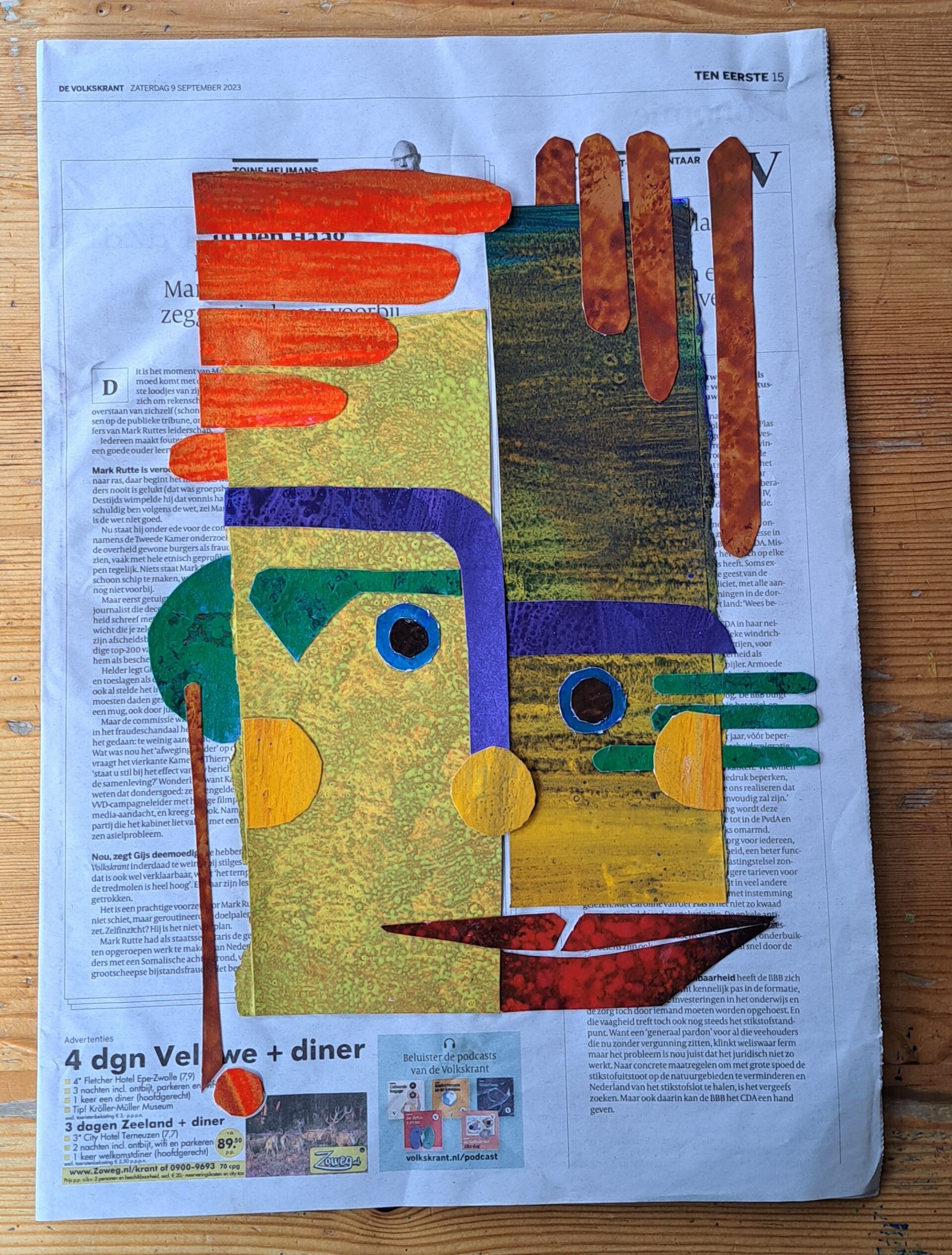 Grote vellen papier zijn bewerkt met veel vloeibare acryl/ inkt op acrylbasis (Golden high flow acrylics) met de kwast opgebracht. Door op de gedroogde laag nog meer inkt te smeren vormen zich meestal bolletjes, van kleur; de inkt wordt door de onderlaag afgestoten. Uit die vellen wordt geknipt. Er wordt geen ontwerp gemaakt; het ene stuk roept het volgend eop en vraagt om het volgende. Een zin, een woord, een vorm uit de krant, de pagina die gebruikt wordt als onderlegger, is de aanleiding van het werk