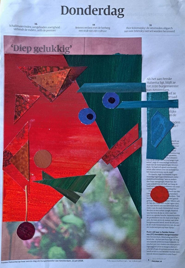 Grote vellen papier zijn bewerkt met veel vloeibare acryl/ inkt op acrylbasis (Golden high flow acrylics) met de kwast opgebracht. Door op de gedroogde laag nog meer inkt te smeren vormen zich meestal bolletjes, van kleur; de inkt wordt door de onderlaag afgestoten. Uit die vellen wordt geknipt. Er wordt geen ontwerp gemaakt; het ene stuk roept het volgend eop en vraagt om het volgende. Een zin, een woord, een vorm uit de krant, de pagina die gebruikt wordt als onderlegger, is de aanleiding van het werk