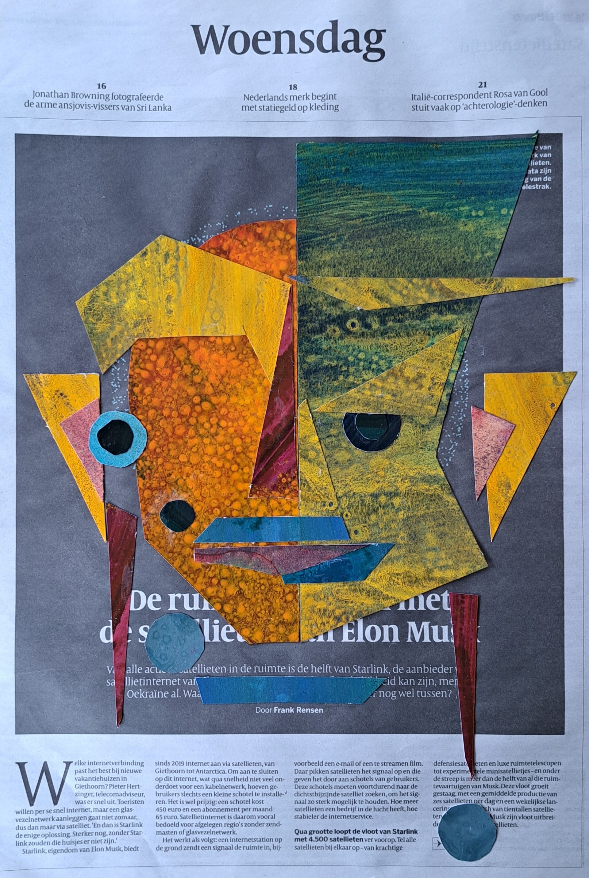 Grote vellen papier zijn bewerkt met veel vloeibare acryl/ inkt op acrylbasis (Golden high flow acrylics) met de kwast opgebracht. Door op de gedroogde laag nog meer inkt te smeren vormen zich meestal bolletjes, van kleur; de inkt wordt door de onderlaag afgestoten. Uit die vellen wordt geknipt. Er wordt geen ontwerp gemaakt; het ene stuk roept het volgend eop en vraagt om het volgende. Een zin, een woord, een vorm uit de krant, de pagina die gebruikt wordt als onderlegger, is de aanleiding van het werk