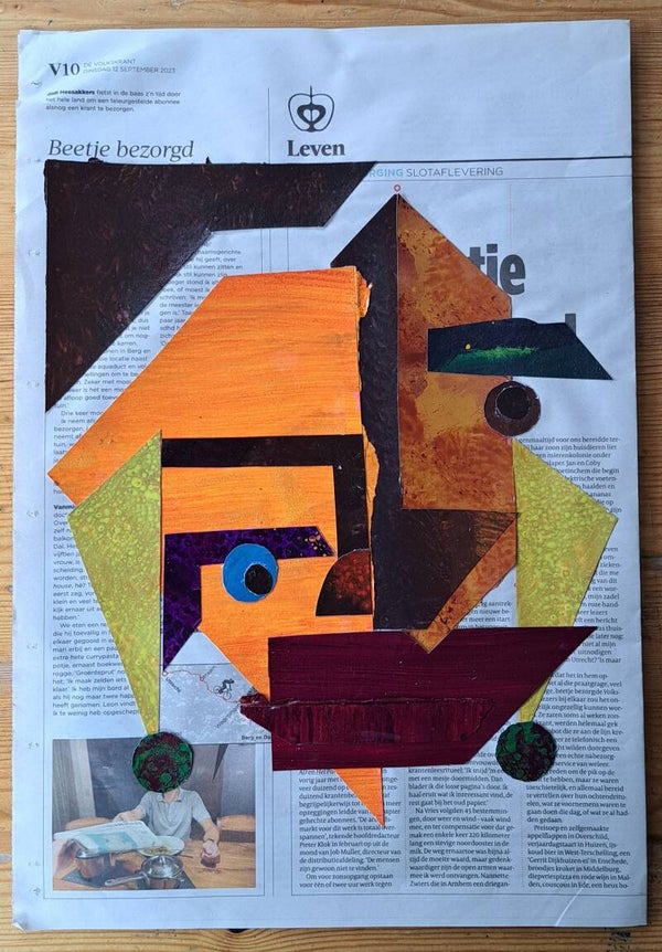 Grote vellen papier zijn bewerkt met veel vloeibare acryl/ inkt op acrylbasis (Golden high flow acrylics) met de kwast opgebracht. Door op de gedroogde laag nog meer inkt te smeren vormen zich meestal bolletjes, van kleur; de inkt wordt door de onderlaag afgestoten. Uit die vellen wordt geknipt. Er wordt geen ontwerp gemaakt; het ene stuk roept het volgend eop en vraagt om het volgende. Een zin, een woord, een vorm uit de krant, de pagina die gebruikt wordt als onderlegger, is de aanleiding van het werk