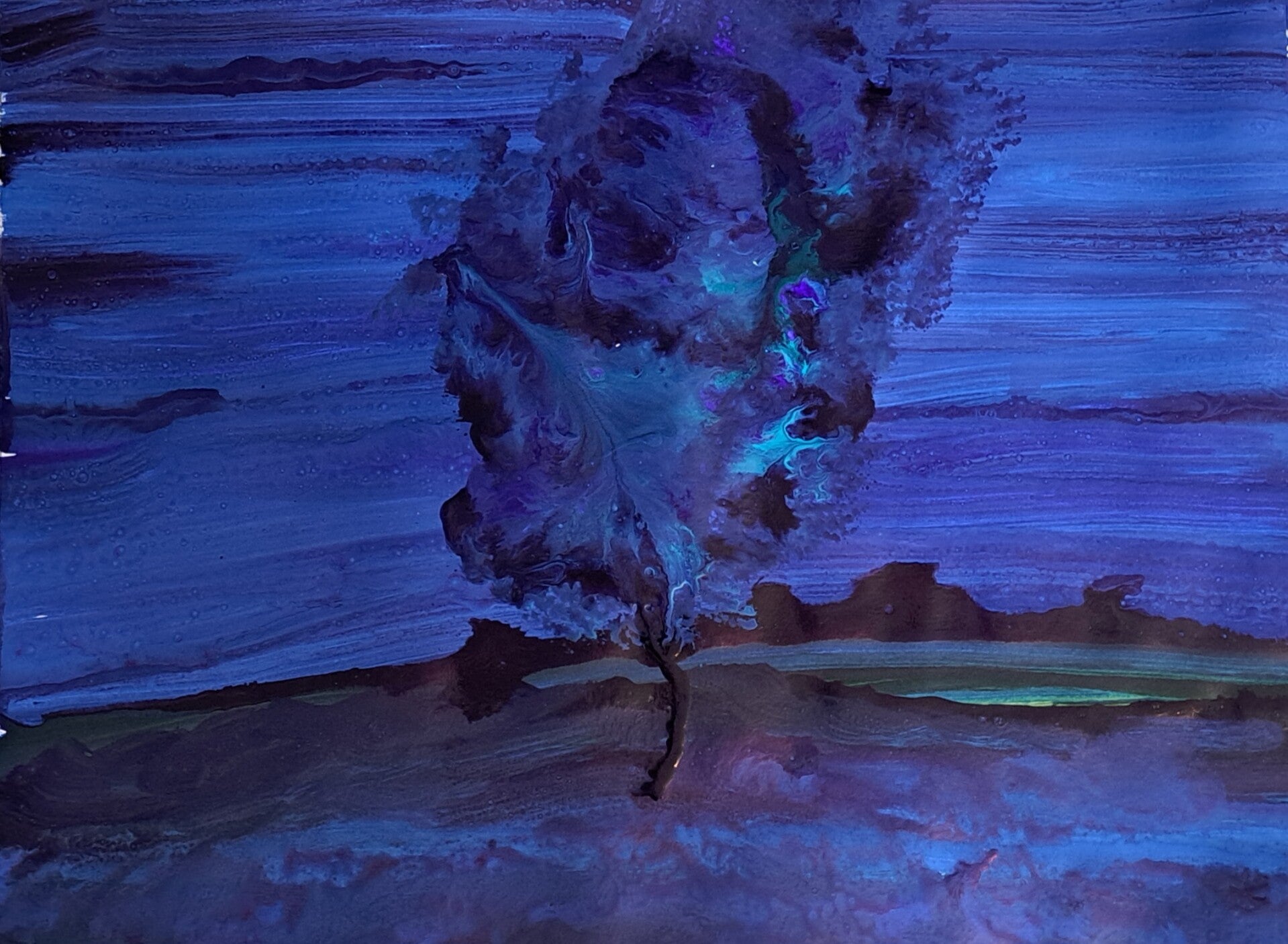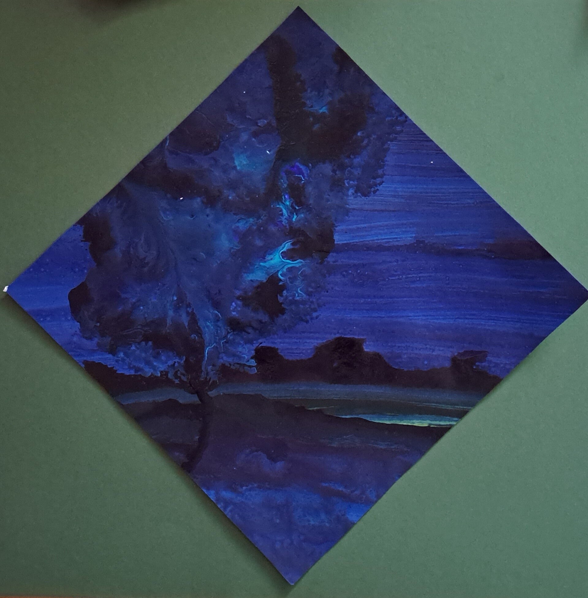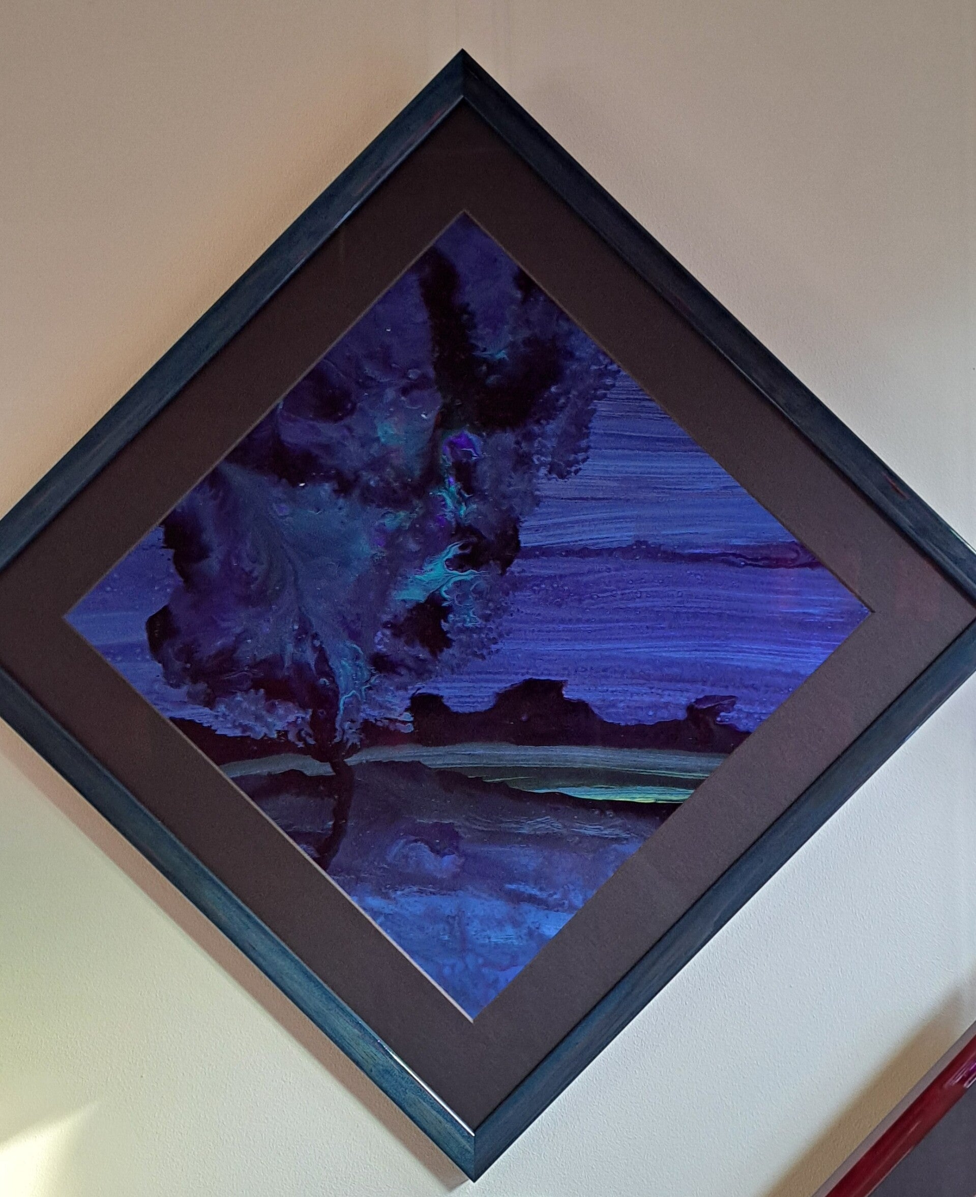 Die ene boom, donker blauwe boom ingelijst: turquoise blauwe lijst.