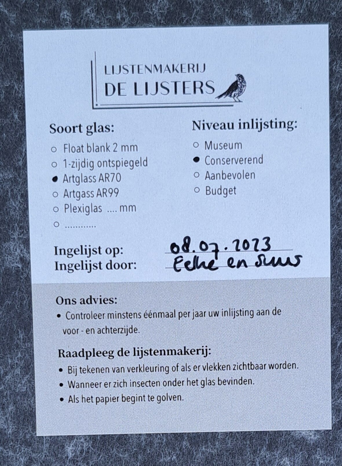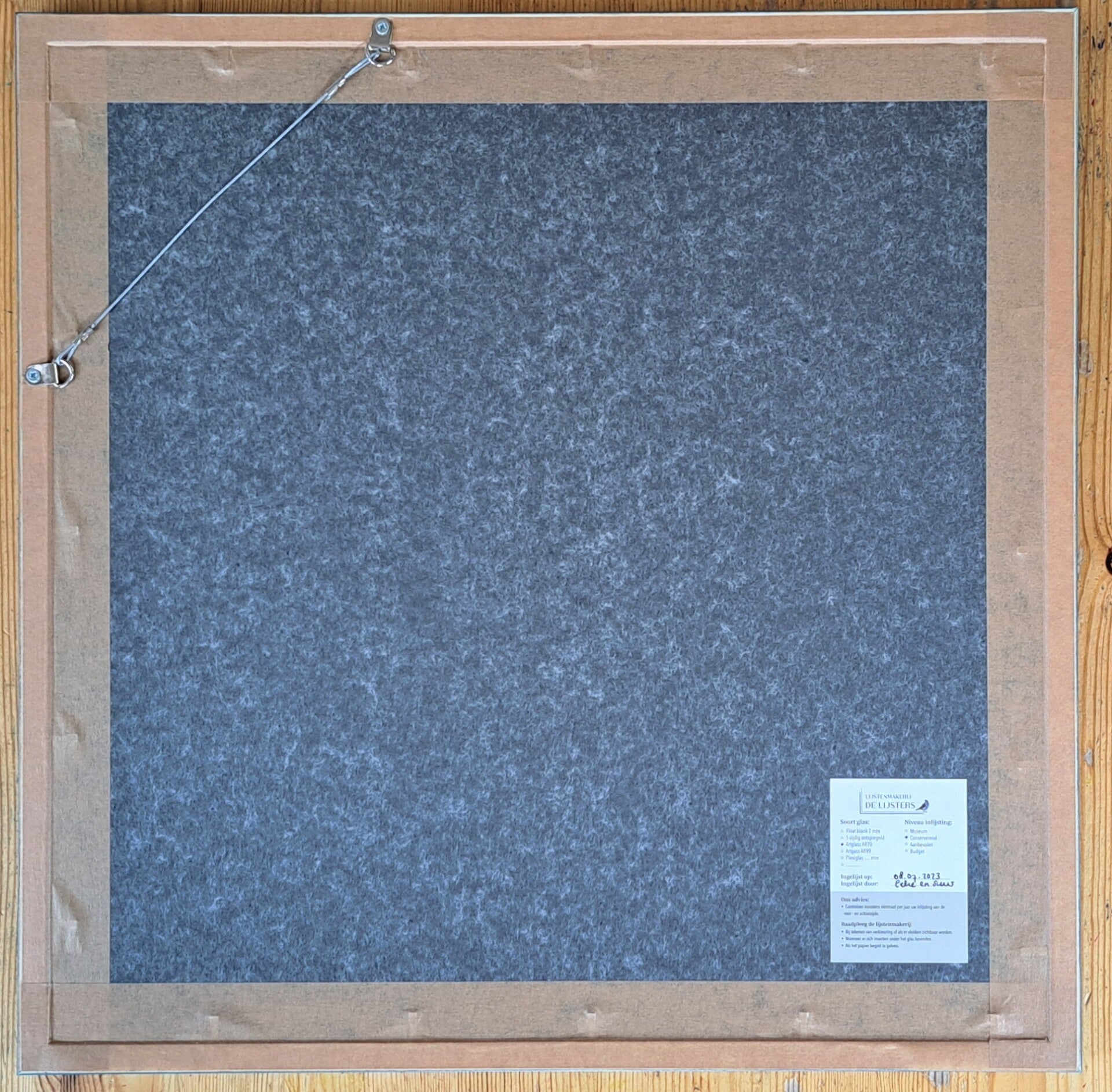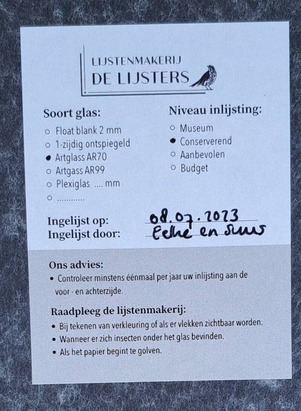 Het werk is ingelijst. Ingelijst door lijstenmakerij 'De Lijsters' (Utrecht) Artglass AR70, niveau Conserverend buitenmaat 55x55 cm.