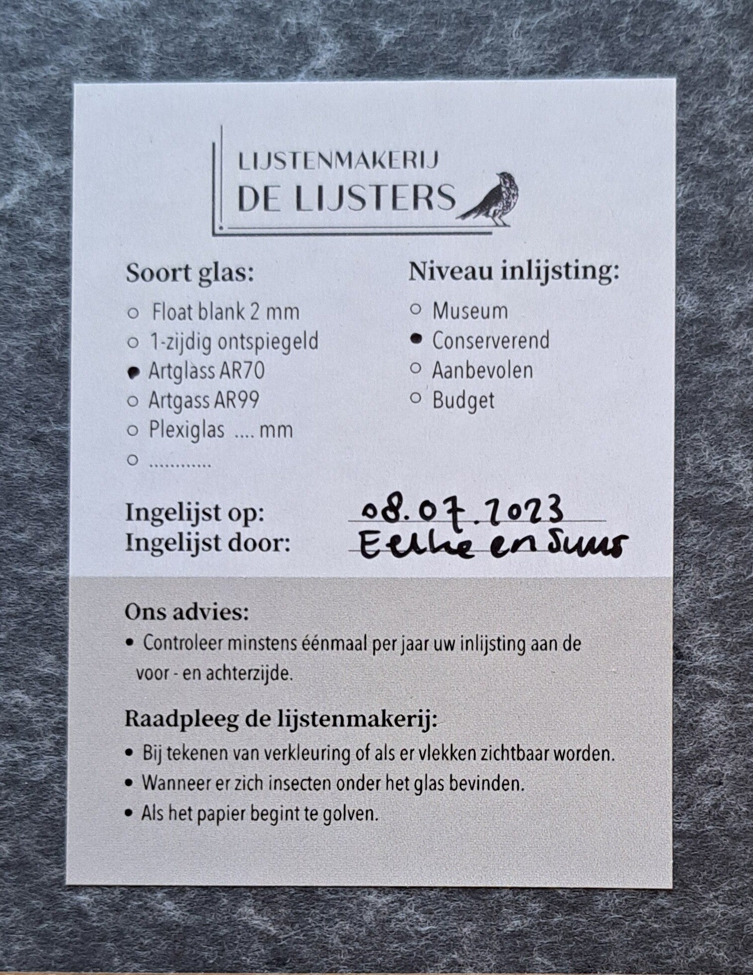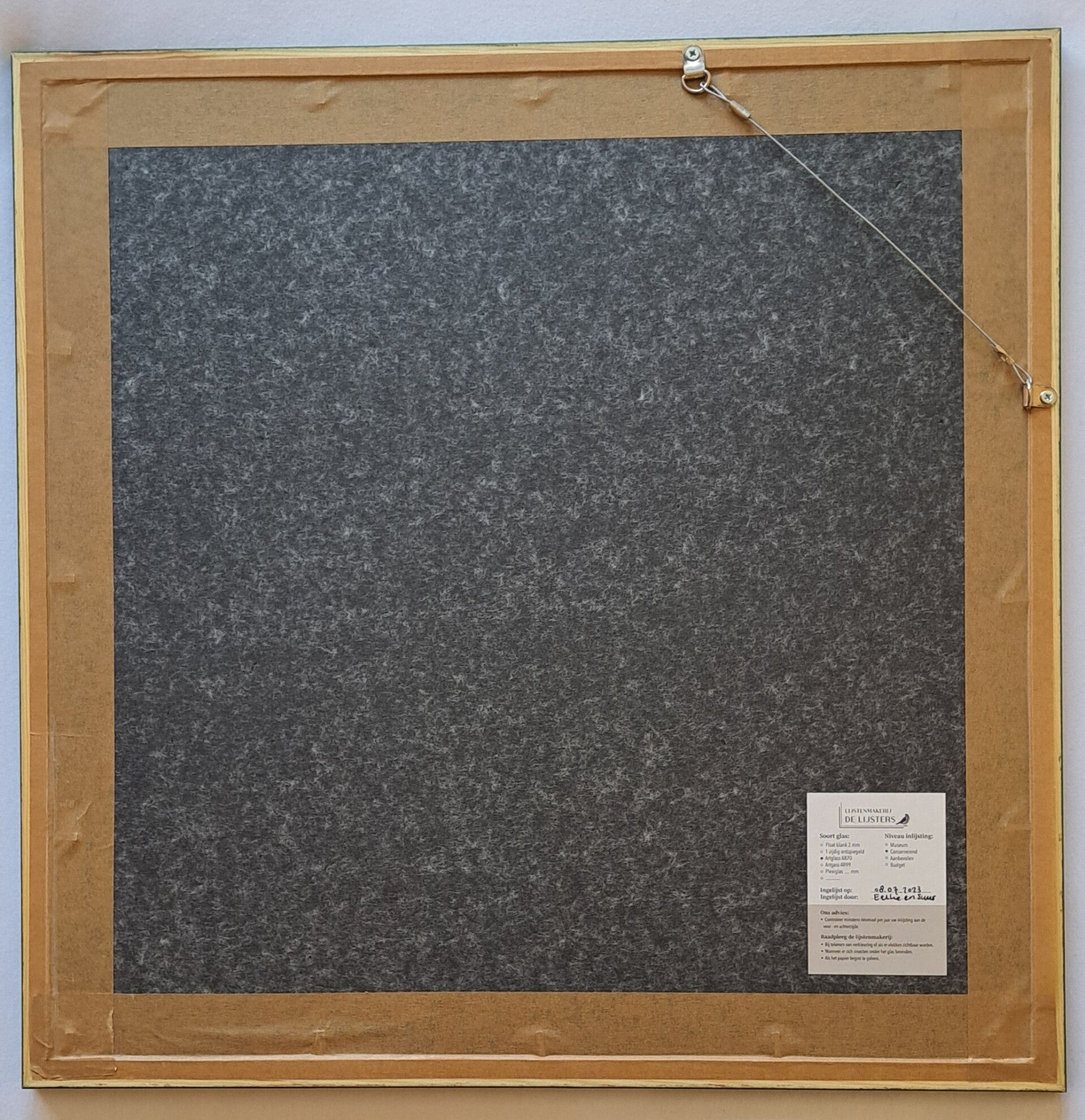 Het werk is ingelijst. Ingelijst door lijstenmakerij 'De Lijsters' (Utrecht) Artglass AR70, niveau Conserverend buitenmaat 55x55 cm.
