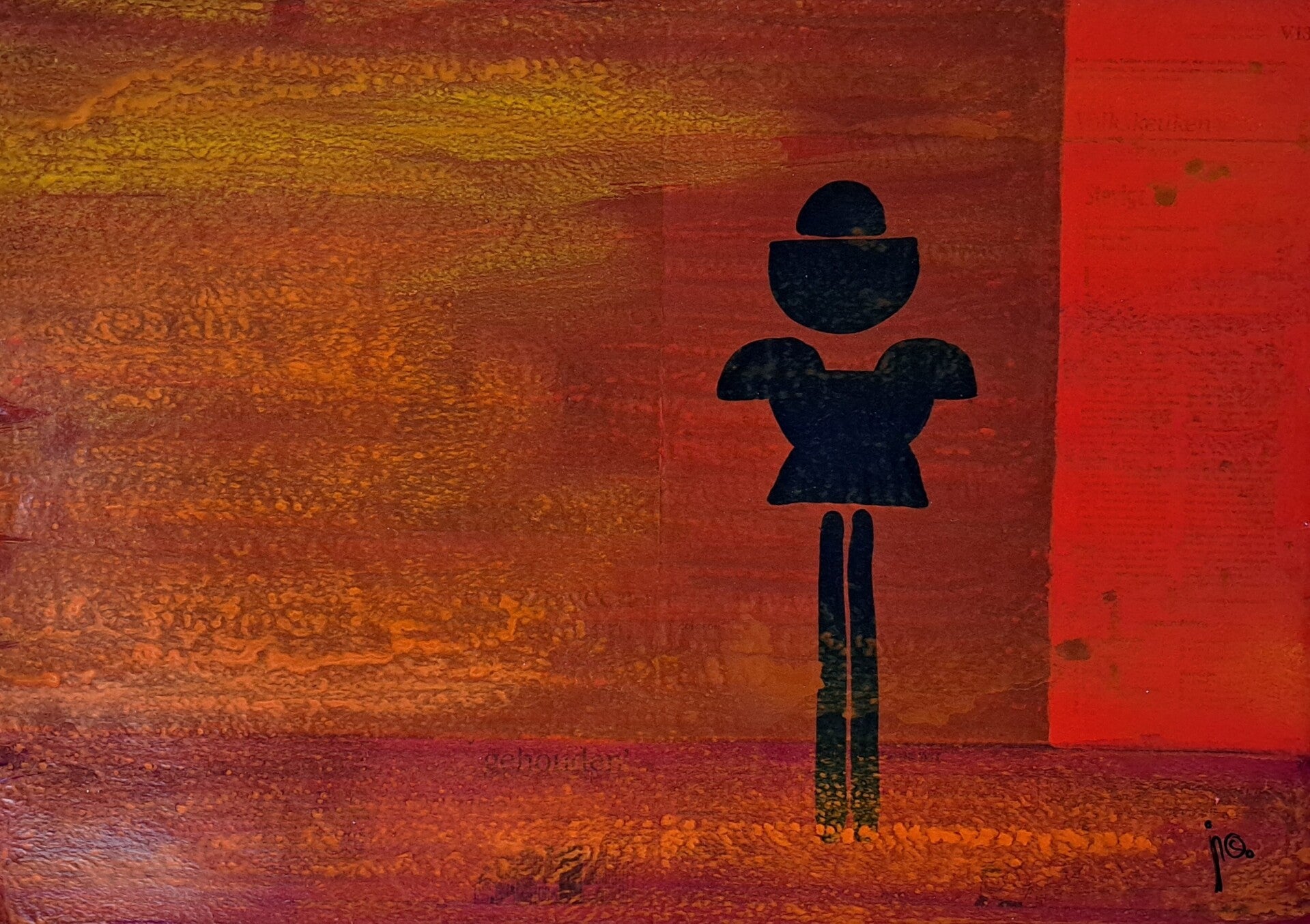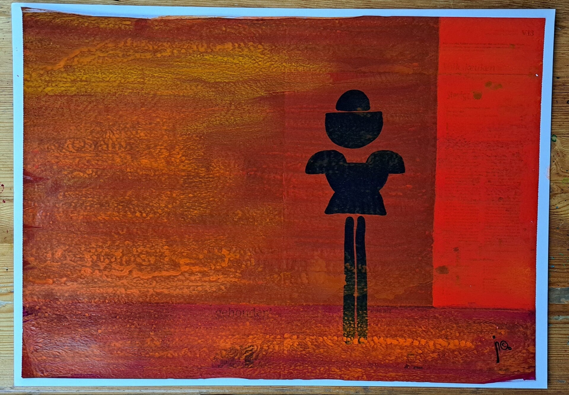 Rafelranden, beschadigingetjes, vouwen ed. maken onderdeel van het werk en zijn inherent aan het schilderen op oud, gebruikt krantenpapier