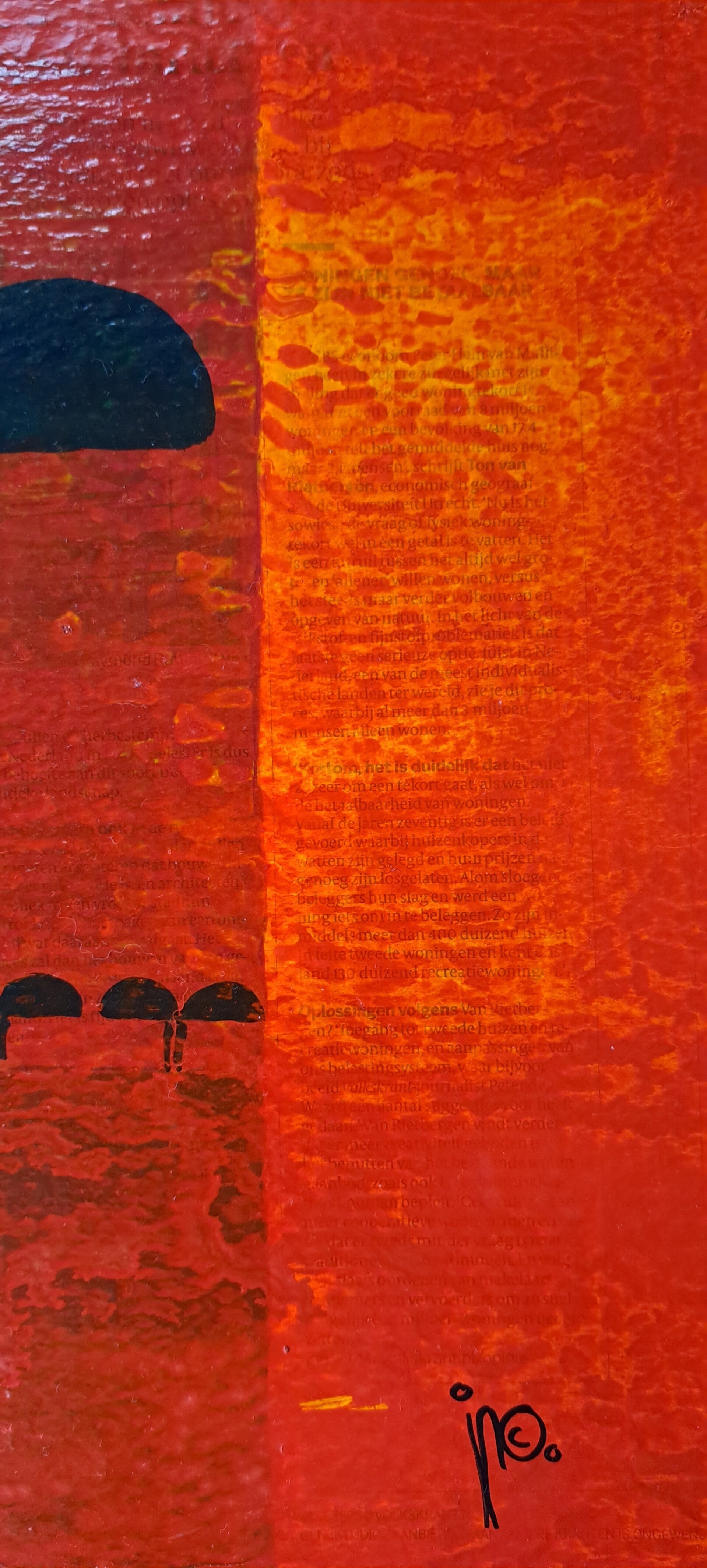 Achtergrond informatie: Inkt geschilderd op gebruikt krantenpapier (dubbele pagina Volkskrant 24 juni 2021): formaat ca.40x57 cm. De letters, tekeningen en/of foto's van de krant schemeren door de inkt, dit geeft een unieke betekenislaag die meer of minder het uiteindelijke beeld bepaalt. De schildering is mede bepaald door de gedrukte indeling, vorm en/of inhoud van de krant.