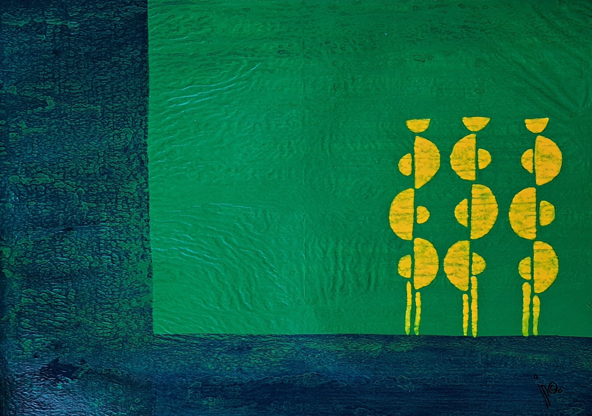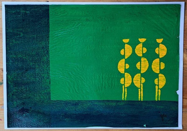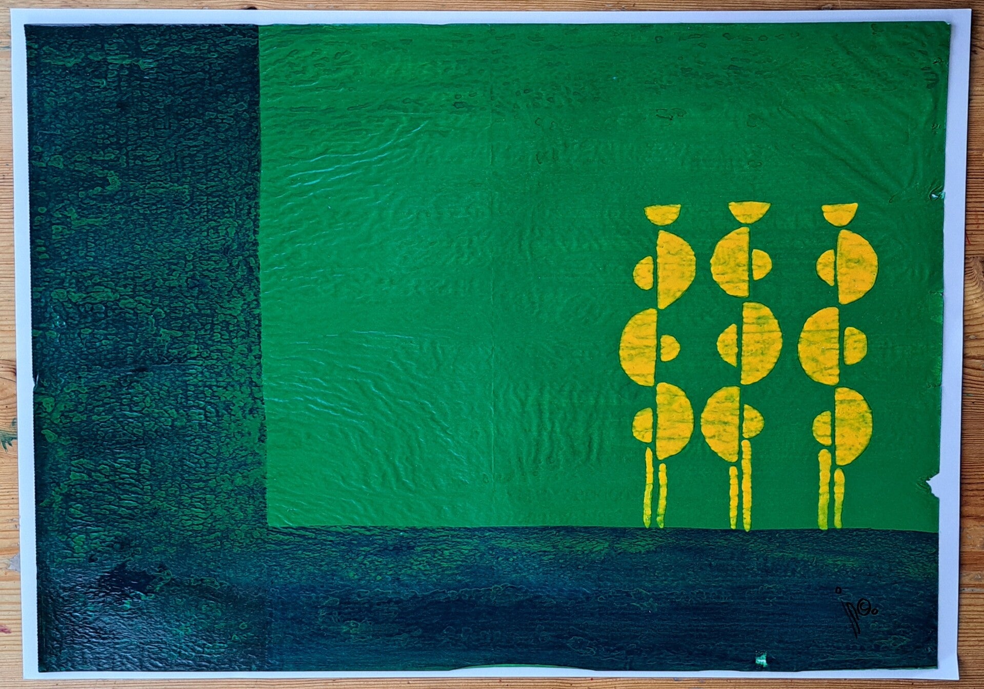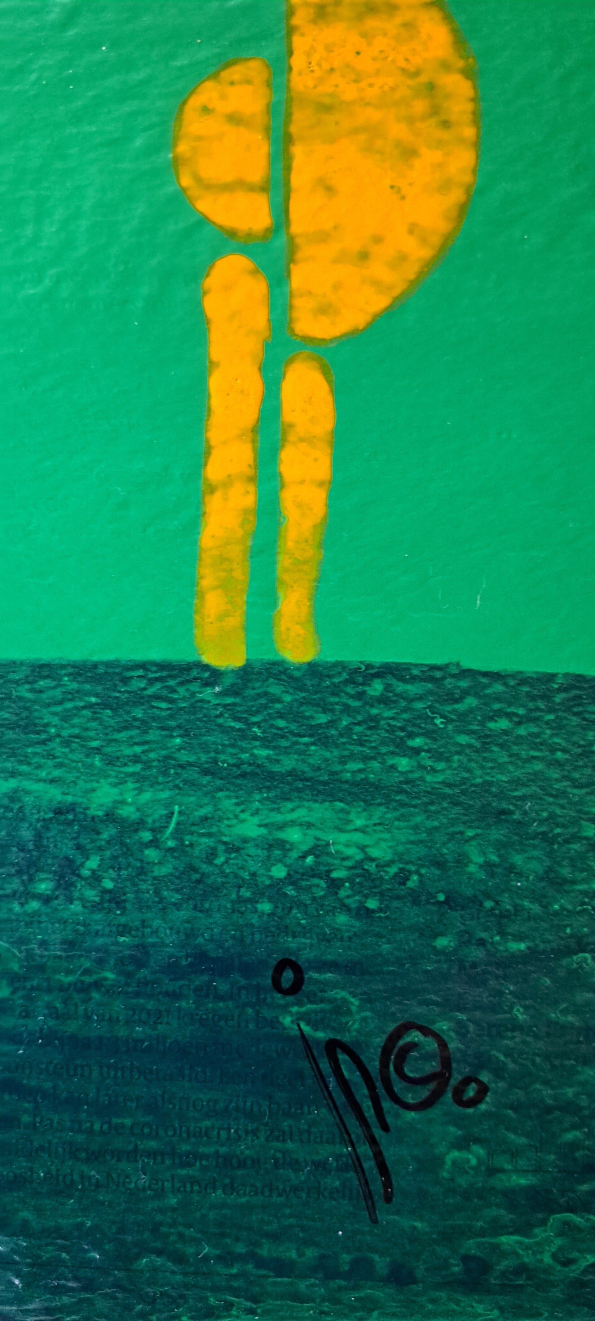 Achtergrond informatie: Inkt geschilderd op gebruikt krantenpapier (dubbele pagina Volkskrant 19 juni 2021): formaat ca.40x57 cm. De letters, tekeningen en/of foto's van de krant schemeren door de inkt, dit geeft een unieke betekenislaag die meer of minder het uiteindelijke beeld bepaalt. De schildering is mede bepaald door de gedrukte indeling, vorm en/of inhoud van de krant.