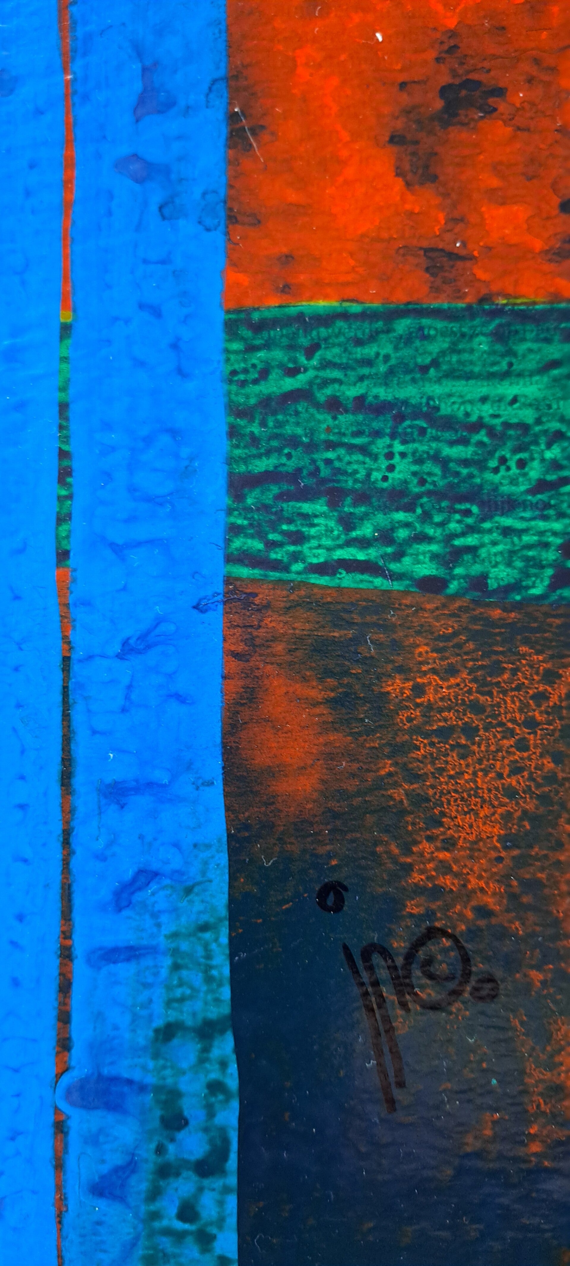 Achtergrond informatie: Inkt geschilderd op gebruikt krantenpapier (dubbele pagina Volkskrant 10 juni 2021): formaat ca.40x57 cm. De letters, tekeningen en/of foto's van de krant schemeren door de inkt, dit geeft een unieke betekenislaag die meer of minder het uiteindelijke beeld bepaalt. De schildering is mede bepaald door de gedrukte indeling, vorm en/of inhoud van de krant.