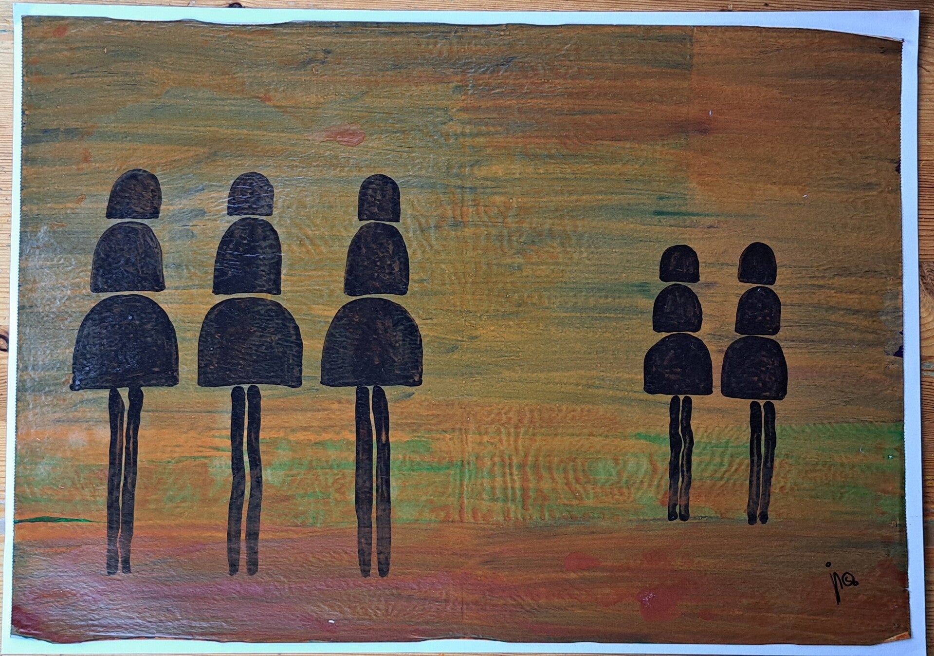 Achtergrond informatie: Inkt geschilderd op gebruikt krantenpapier (dubbele pagina Volkskrant 12 juni 2021): formaat ca.40x57 cm. De letters, tekeningen en/of foto's van de krant schemeren door de inkt, dit geeft een unieke betekenislaag die meer of minder het uiteindelijke beeld bepaalt. De schildering is mede bepaald door de gedrukte indeling, vorm en/of inhoud van de krant.
