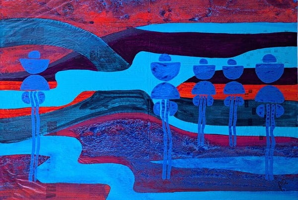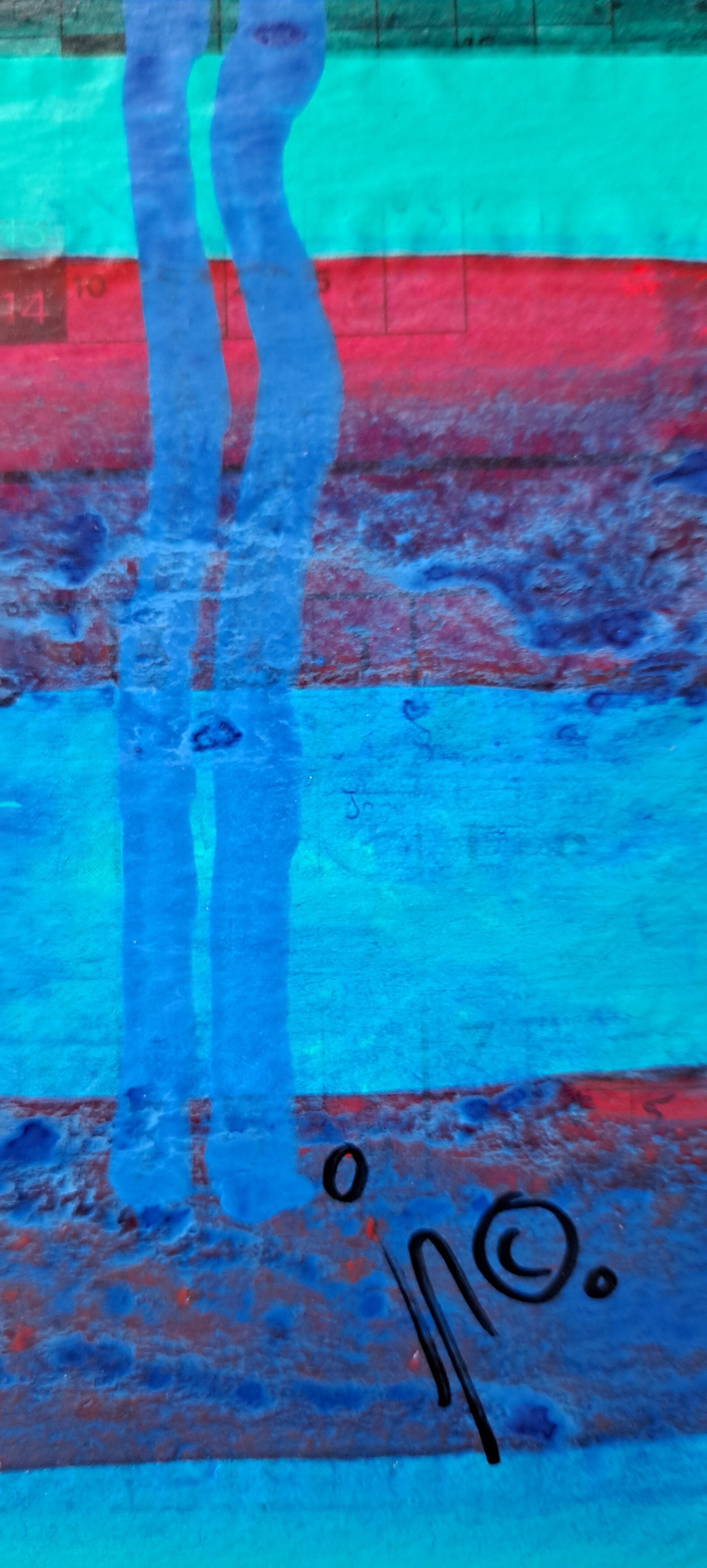 Achtergrond informatie: Inkt geschilderd op gebruikt krantenpapier (dubbele pagina Volkskrant 25 juni 2021): formaat ca.40x57 cm. De letters, tekeningen en/of foto's van de krant schemeren door de inkt, dit geeft een unieke betekenislaag die meer of minder het uiteindelijke beeld bepaalt. De schildering is mede bepaald door de gedrukte indeling, vorm en/of inhoud van de krant.