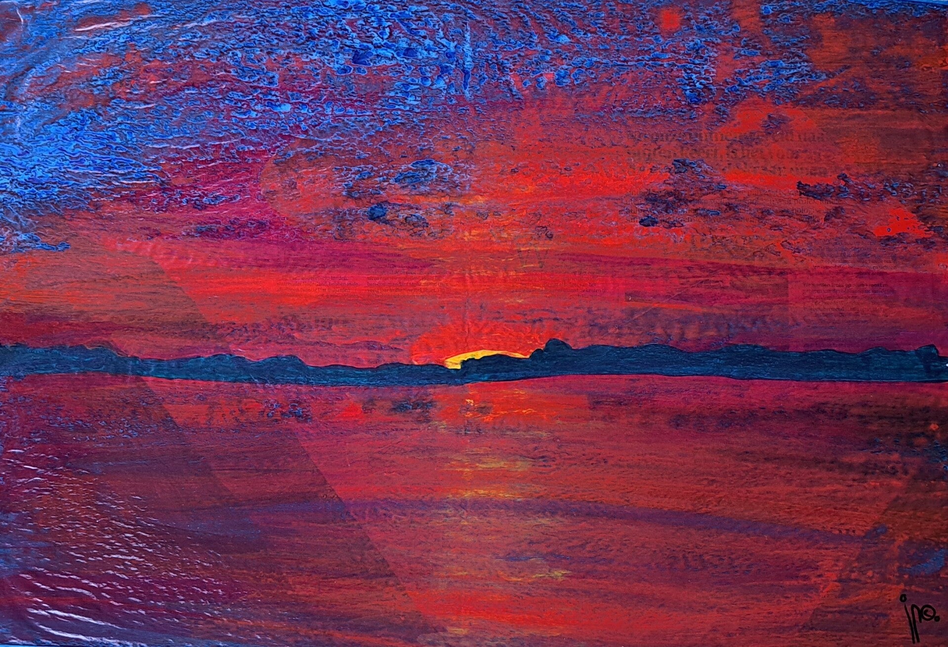 Achtergrond informatie: Inkt geschilderd op gebruikt krantenpapier (dubbele pagina Volkskrant 12 augustus 2021): formaat ca.40x57 cm. De letters, tekeningen en/of foto's van de krant schemeren door de inkt, dit geeft een unieke betekenislaag die meer of minder het uiteindelijke beeld bepaalt.