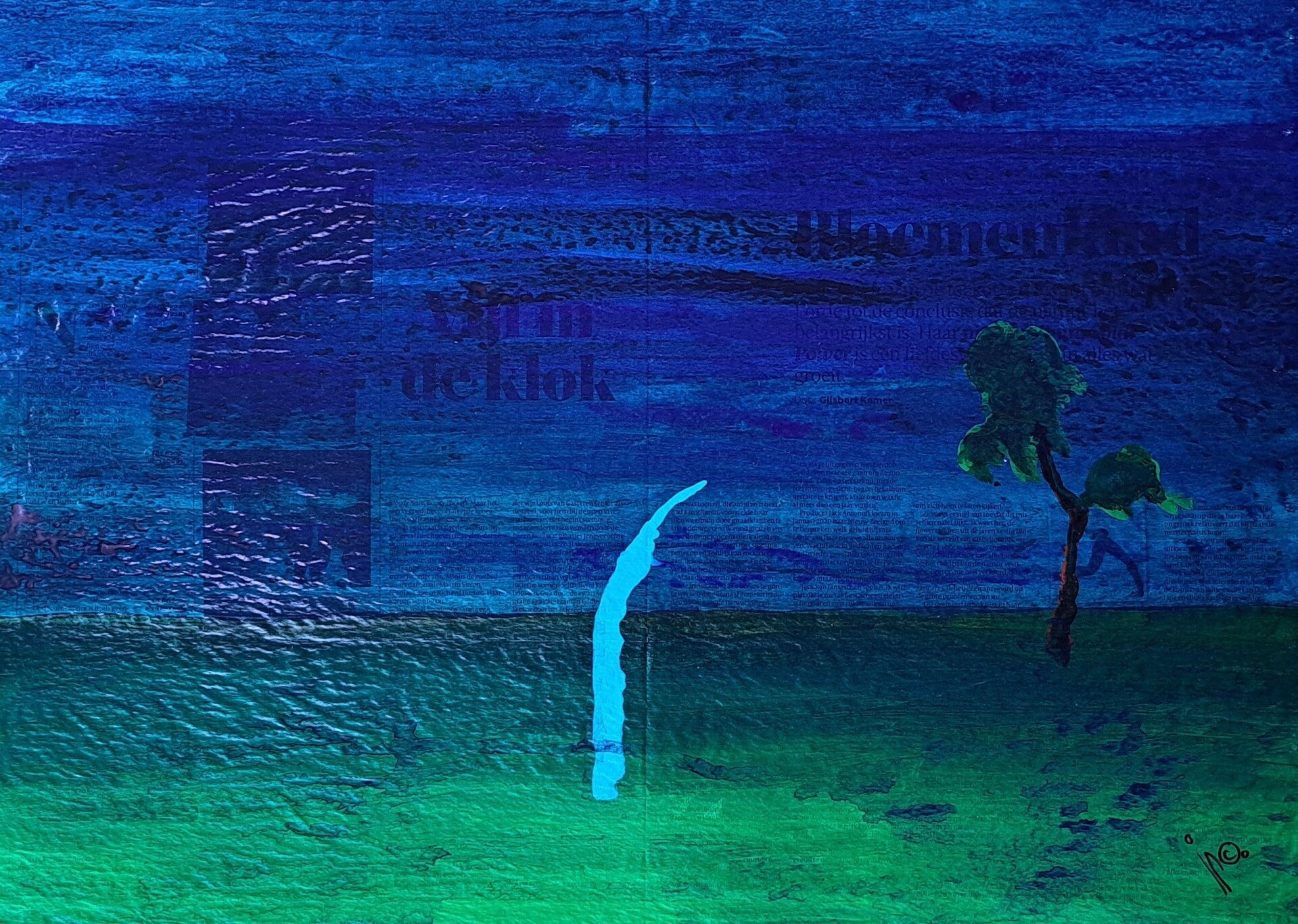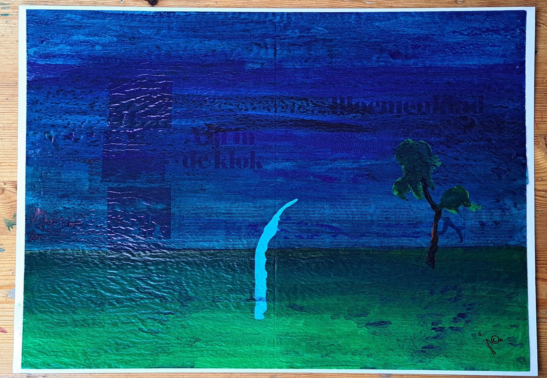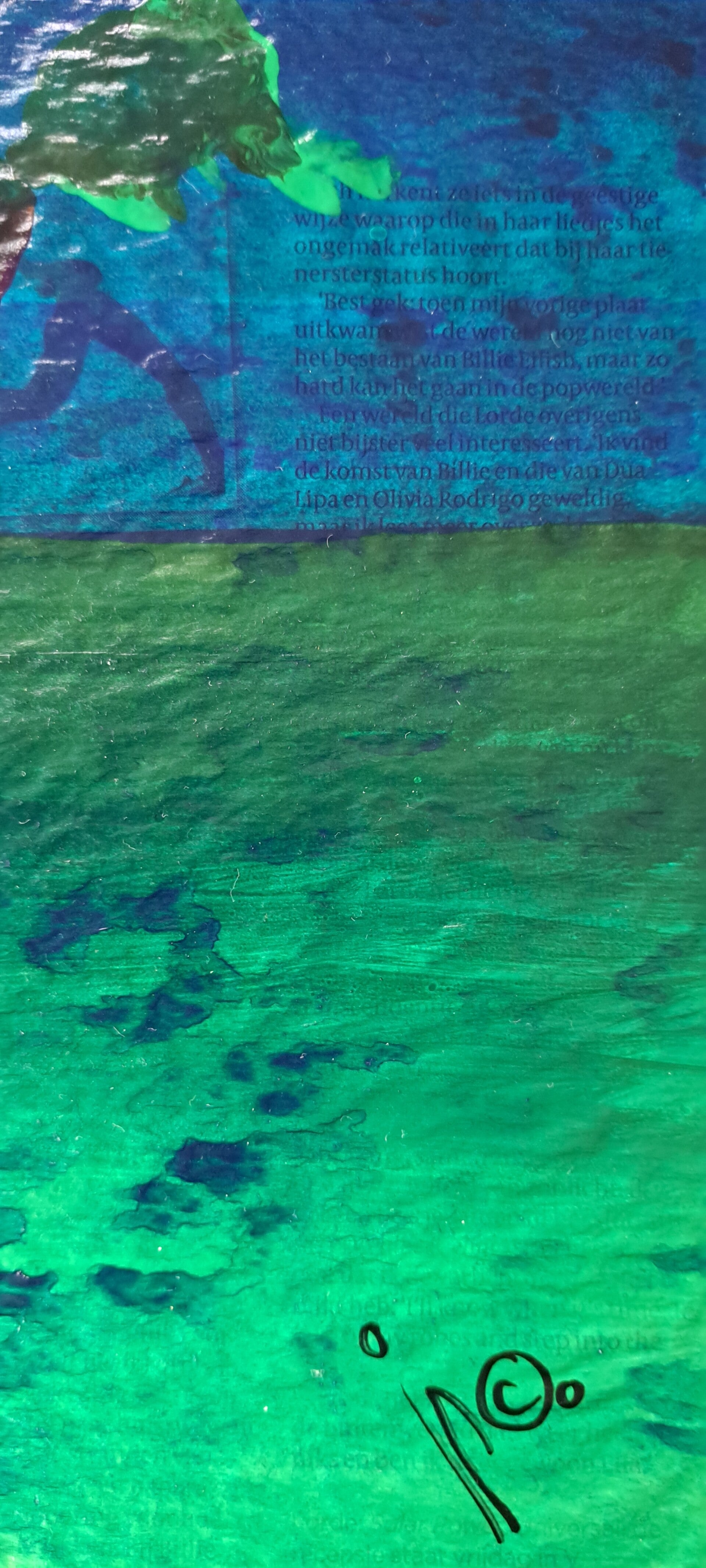 Achtergrond informatie: Inkt geschilderd op gebruikt krantenpapier (dubbele pagina Volkskrant 19 augustus 2021): formaat ca.40x57 cm. De letters, tekeningen en/of foto's van de krant schemeren door de inkt, dit geeft een unieke betekenislaag die meer of minder het uiteindelijke beeld bepaalt.