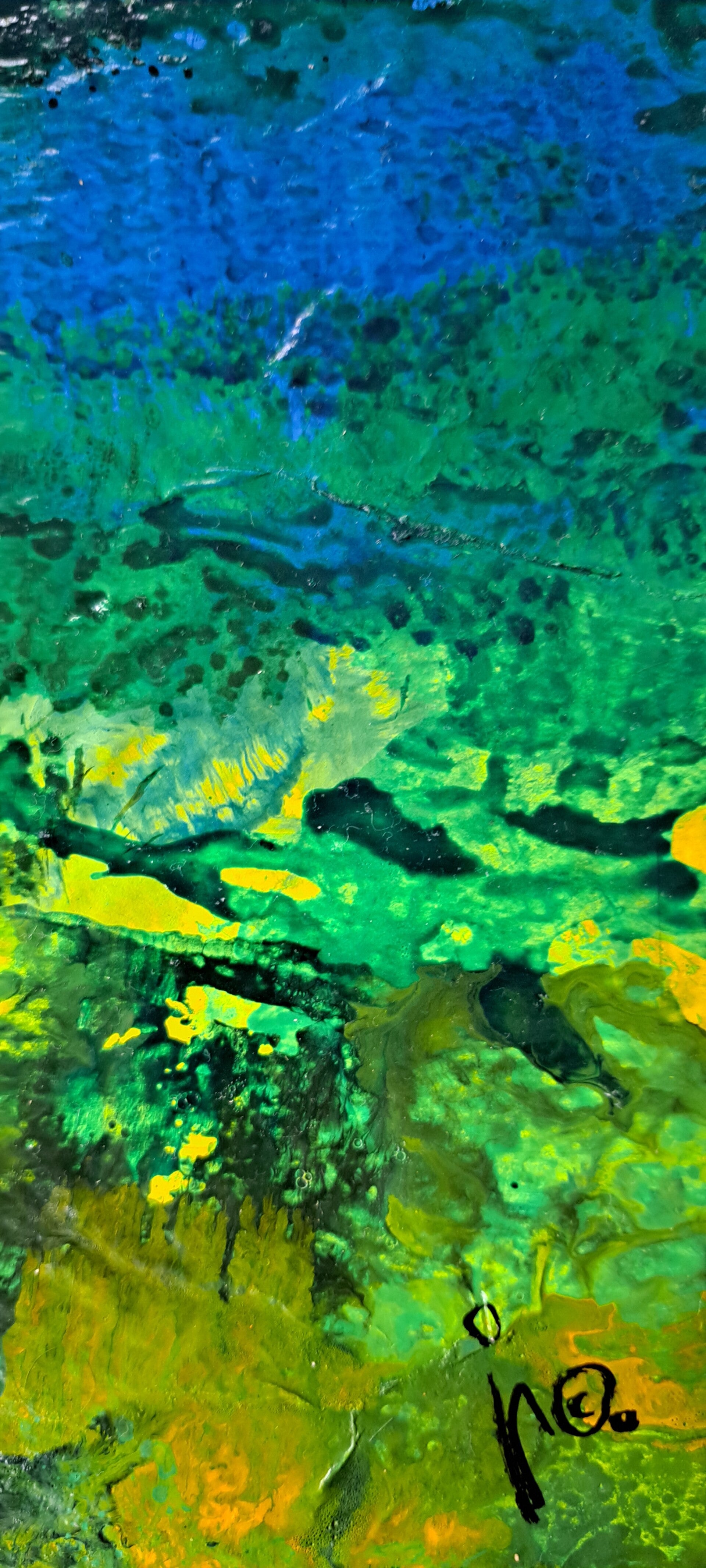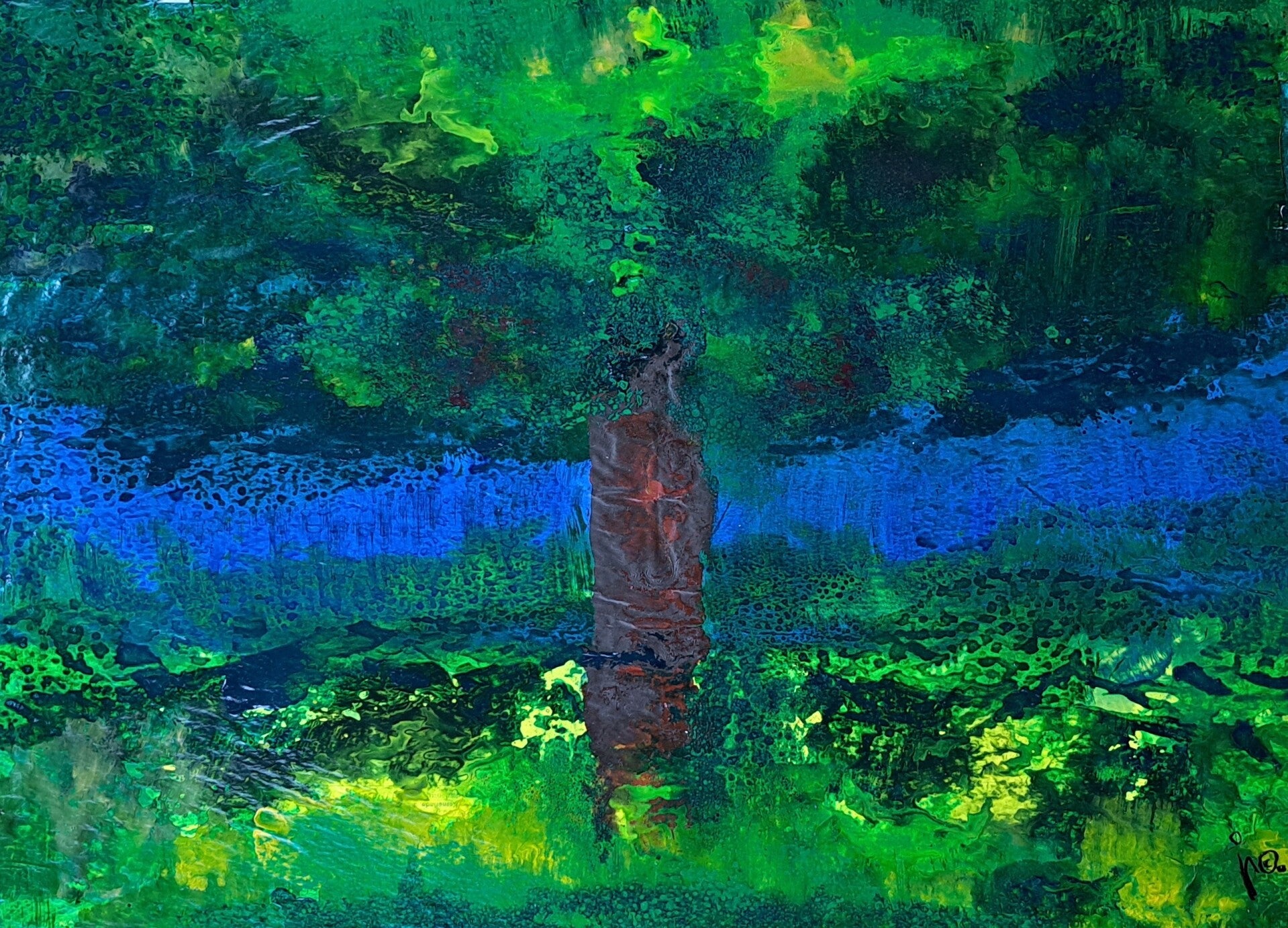 Achtergrond informatie: Inkt geschilderd op gebruikt krantenpapier (dubbele pagina Volkskrant 11 maart 2023): formaat ca.40x57 cm. De letters, tekeningen en/of foto's van de krant schemeren door de inkt, dit geeft een unieke betekenislaag die meer of minder het uiteindelijke beeld bepaalt.