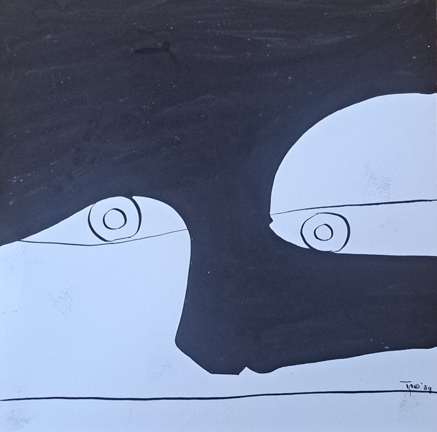 Achtergrond informatie: Er is een ontwerpje gemaakt, het ontwerp is met kroontjespen en Oostindische inkt op stevig papier/ bijna karton overgenomen. Met een penseeltje zijn vlakken zwart ingekleurd (niet egaal dekkend). Formaat ca.21,5x21,5cm. Het werk is gemaakt in 1989.