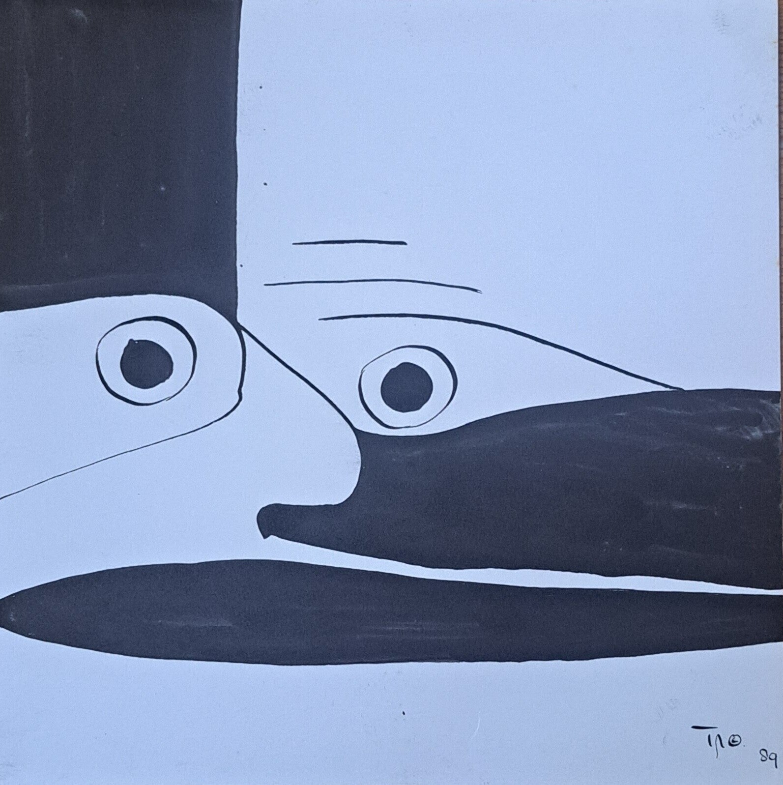 Achtergrond informatie: Er is een ontwerpje gemaakt, het ontwerp is met kroontjespen en Oostindische inkt op stevig papier/ bijna karton overgenomen. Met een penseeltje zijn vlakken zwart ingekleurd (niet egaal dekkend). Formaat ca.21,5x21,5cm. Het werk is gemaakt in 1989.