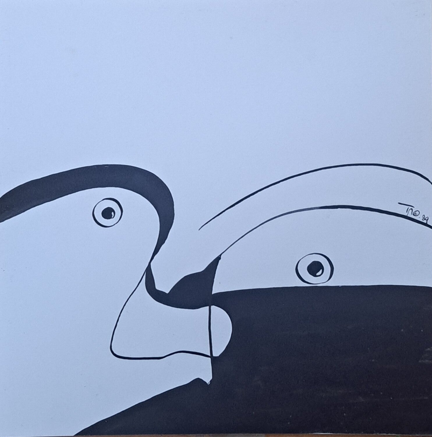 Achtergrond informatie: Er is een ontwerpje gemaakt, het ontwerp is met kroontjespen en Oostindische inkt op stevig papier/ bijna karton overgenomen. Met een penseeltje zijn vlakken zwart ingekleurd (niet egaal dekkend). Formaat ca.21,5x21,5cm. Het werk is gemaakt in 1989.