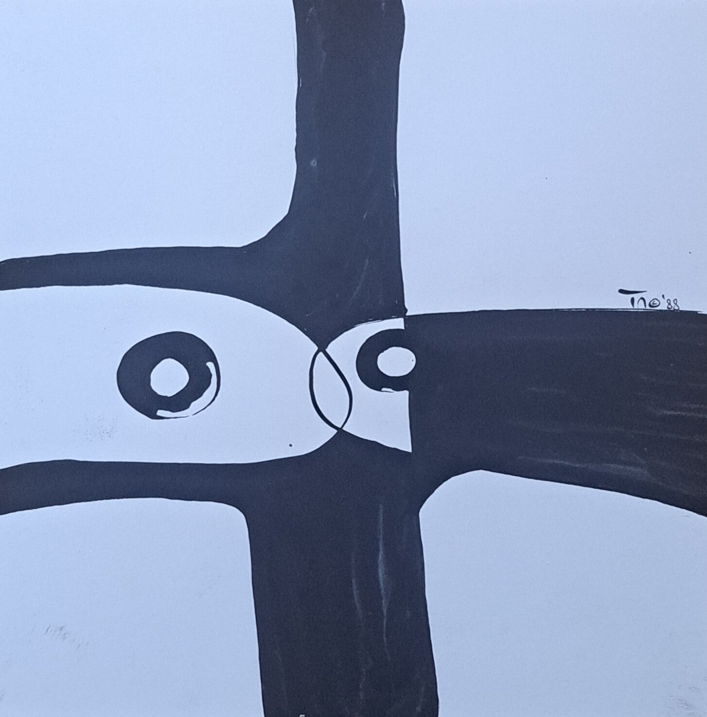 Achtergrond informatie: Er is een ontwerpje gemaakt, het ontwerp is met kroontjespen en Oostindische inkt op stevig papier/ bijna karton overgenomen. Met een penseeltje zijn vlakken zwart ingekleurd (niet egaal dekkend). Formaat ca.21,5x21,5cm. Het werk is gemaakt in 1988.