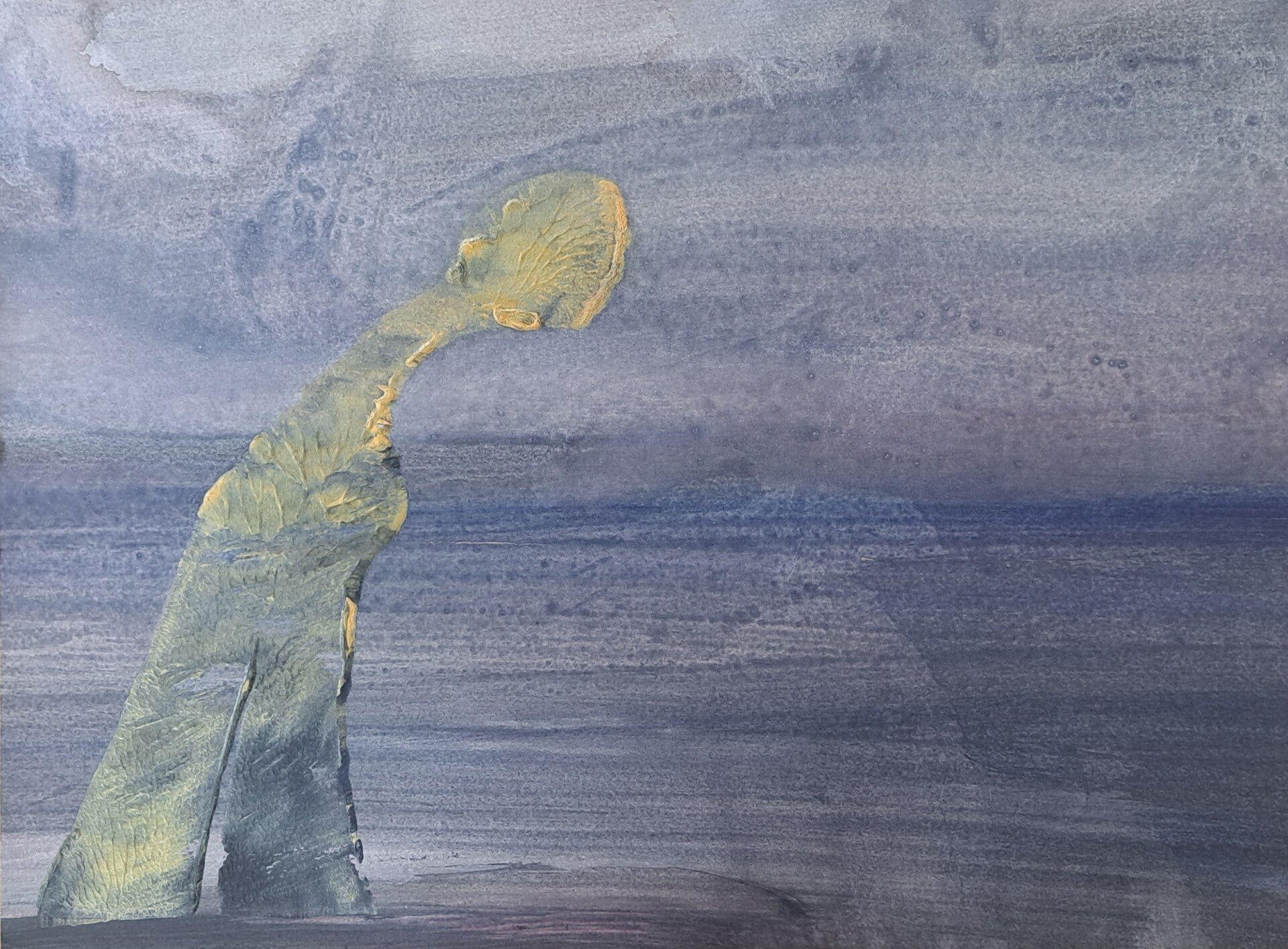 Formaat:beeldmaat ca. 30x40 cm, geschilderd met acrylverf op papier; de figuur is gestempeld met een in de vorm gezaagd stuk hout.