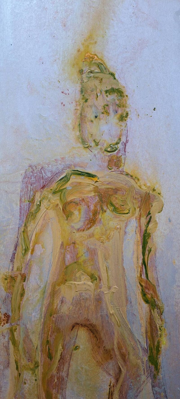 Achtergrond. Dit werk is er een uit een serie van 105 schilderijen. Ik volgde de ontwikkeling vanaf kleuters tot kunstenaars al staat die ontwikkeling niet vast en nam 'vrouwen' als onderwerp. De mate van waarneming en het beheersen van vaardigheden bepalen hoe een vrouw weergegeven wordt.