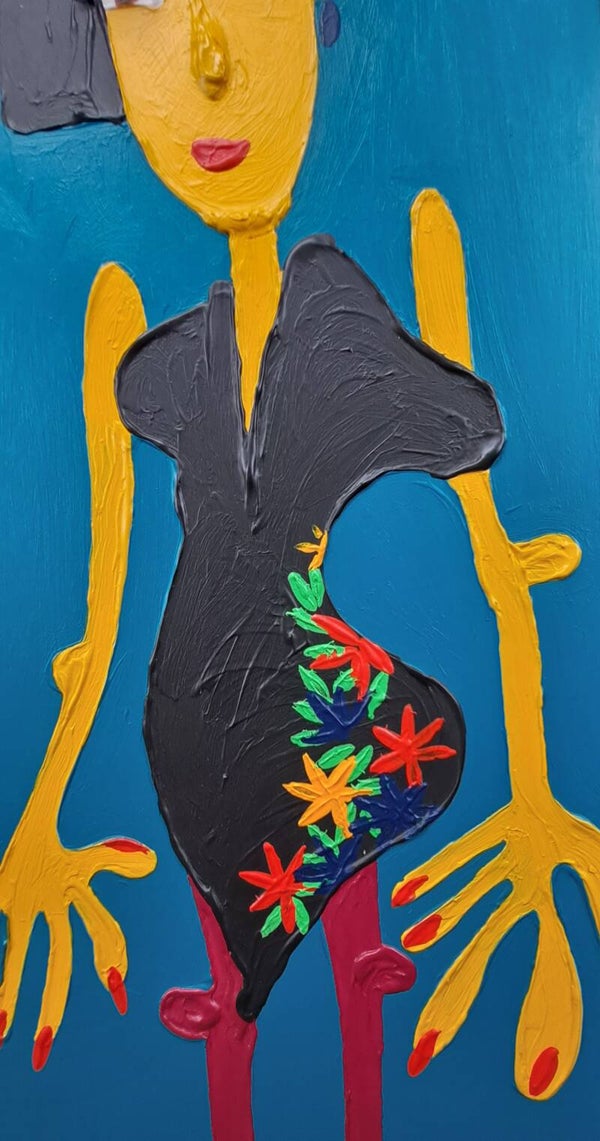 Achtergrond. Dit werk is er een uit een serie van 105 schilderijen. Ik volgde de ontwikkeling vanaf kleuters tot kunstenaars al staat die ontwikkeling niet vast en nam 'vrouwen' als onderwerp. De mate van waarneming en het beheersen van vaardigheden bepalen hoe een vrouw weergegeven wordt.