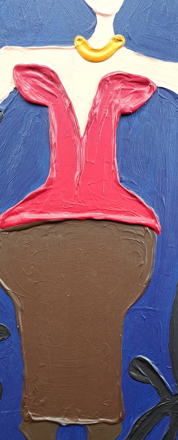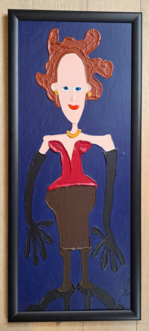 Achtergrond. Dit werk is er een uit een serie van 105 schilderijen. Ik volgde de ontwikkeling vanaf kleuters tot kunstenaars al staat die ontwikkeling niet vast en nam 'vrouwen' als onderwerp. De mate van waarneming en het beheersen van vaardigheden bepalen hoe een vrouw weergegeven wordt.