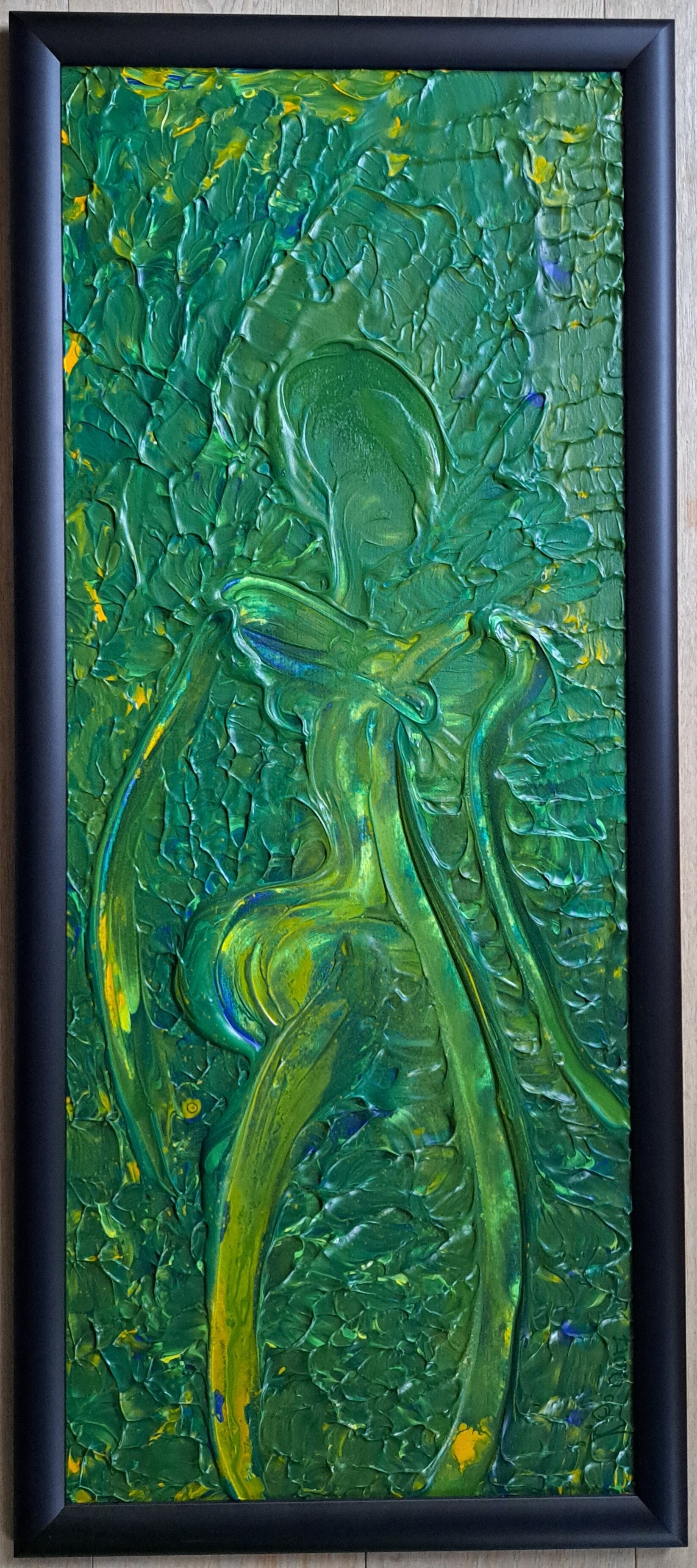 Achtergrond. Dit werk is er een uit een serie van 105 schilderijen. Ik volgde de ontwikkeling vanaf kleuters tot kunstenaars al staat die ontwikkeling niet vast en nam 'vrouwen' als onderwerp. De mate van waarneming en het beheersen van vaardigheden bepalen hoe een vrouw weergegeven wordt.