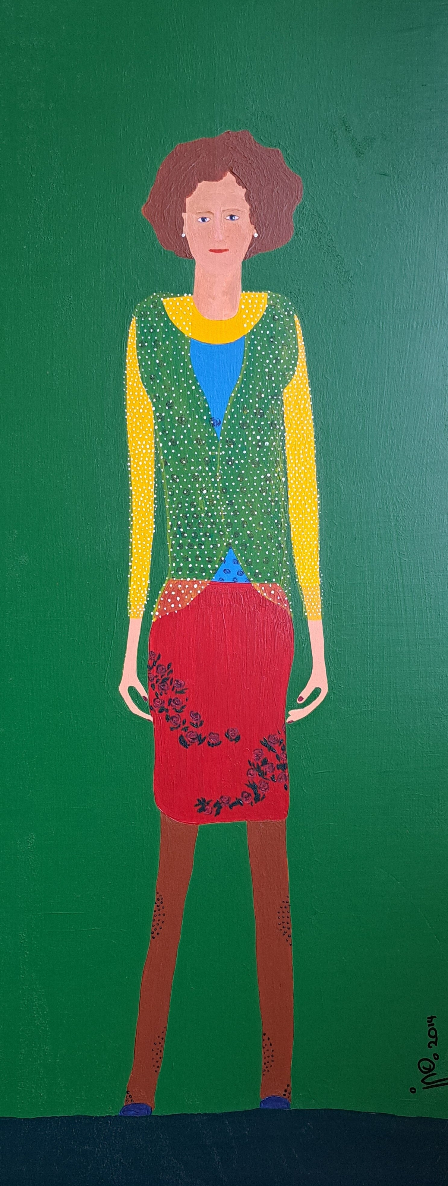 Achtergrond. Dit werk is er een uit een serie van 105 schilderijen. Ik volgde de ontwikkeling vanaf kleuters tot kunstenaars al staat die ontwikkeling niet vast en nam 'vrouwen' als onderwerp. De mate van waarneming en het beheersen van vaardigheden bepalen hoe een vrouw weergegeven wordt.