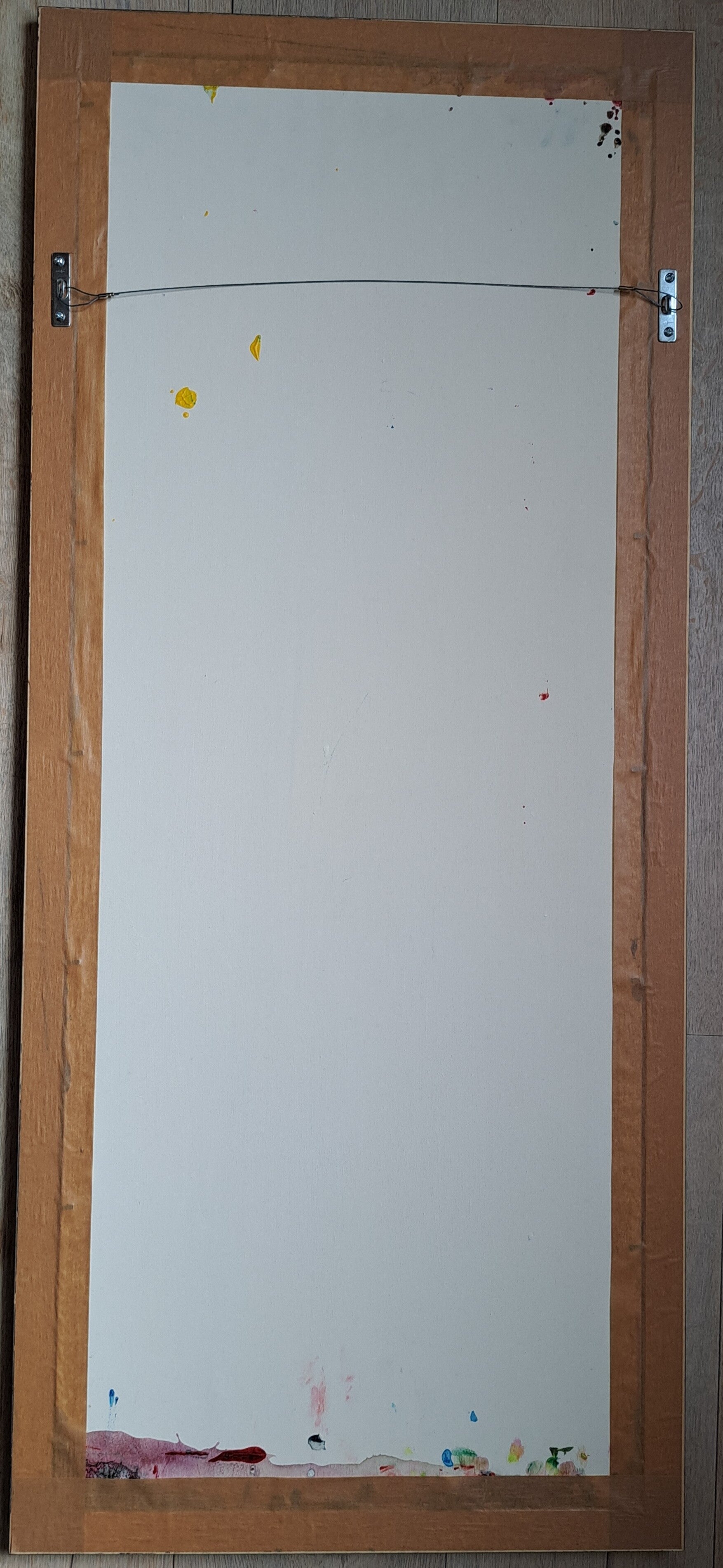 Formaat:beeldmaat ca. 40x96 cm, met lijst 56x116 cm, geschilderd met acrylverf op triplex.