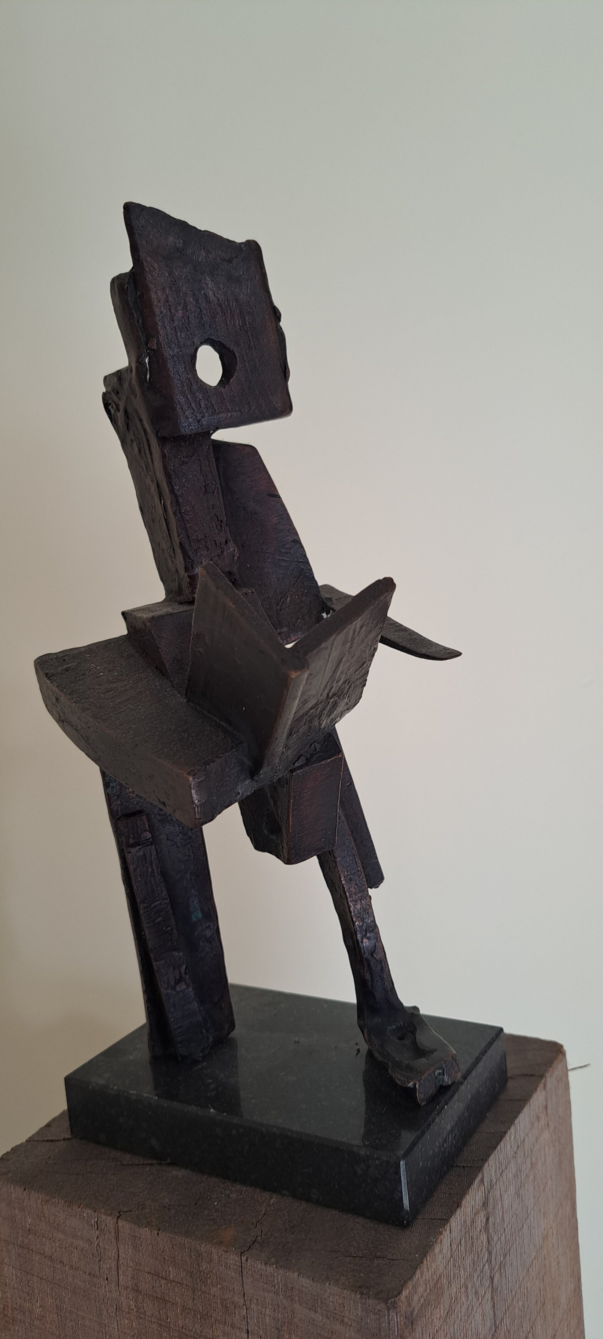 Werkproces: Met resthout is dit beeld opgebouwd. Het hout is niet bewerkt, zoeken naar wat er al is, restmateriaal vanuit de zagerij. Stukjes uit de afvalbak aan elkaar gelijmd tot de lezer.