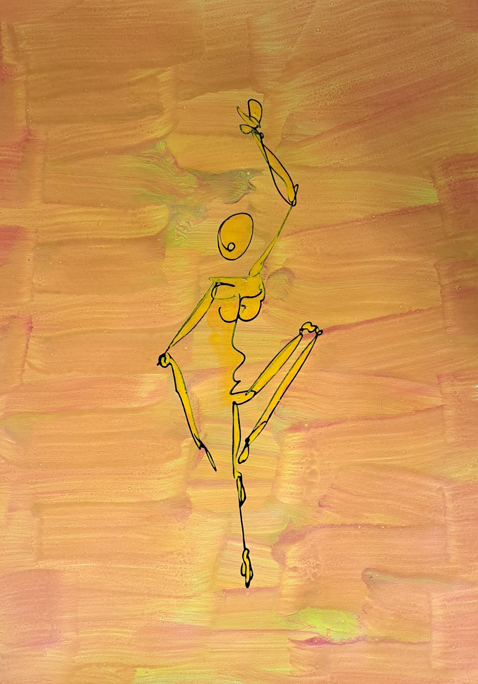 Achtergrond informatie: Met vloeibare acryl - inkt op acrylbasis (Golden high flow acrylics) is de achtergrond neergezet. Op basis wat de achtergrond toont, wordt de figuur spontaan in een paar halen neer gezet en (iets) ingekleurd.