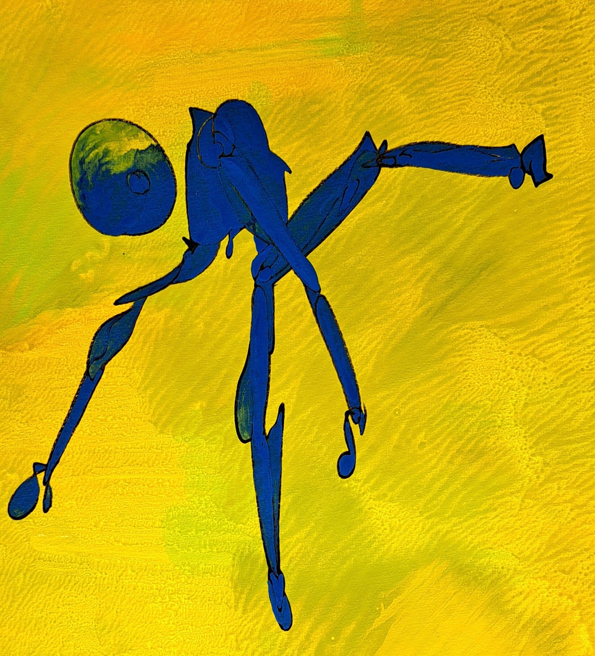 Achtergrond informatie: Met vloeibare acryl - inkt op acrylbasis (Golden high flow acrylics) is de achtergrond neergezet. Op basis wat de achtergrond toont, wordt de figuur spontaan in een paar halen neer gezet en (iets) ingekleurd.