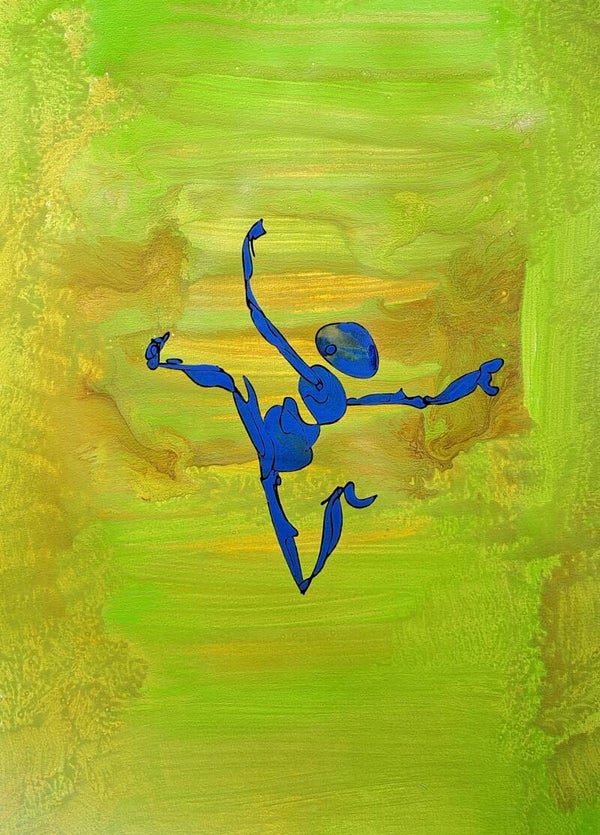 Achtergrond informatie: Met vloeibare acryl - inkt op acrylbasis (Golden high flow acrylics) is de achtergrond neergezet. Op basis wat de achtergrond toont, wordt de figuur spontaan in een paar halen neer gezet en (iets) ingekleurd.