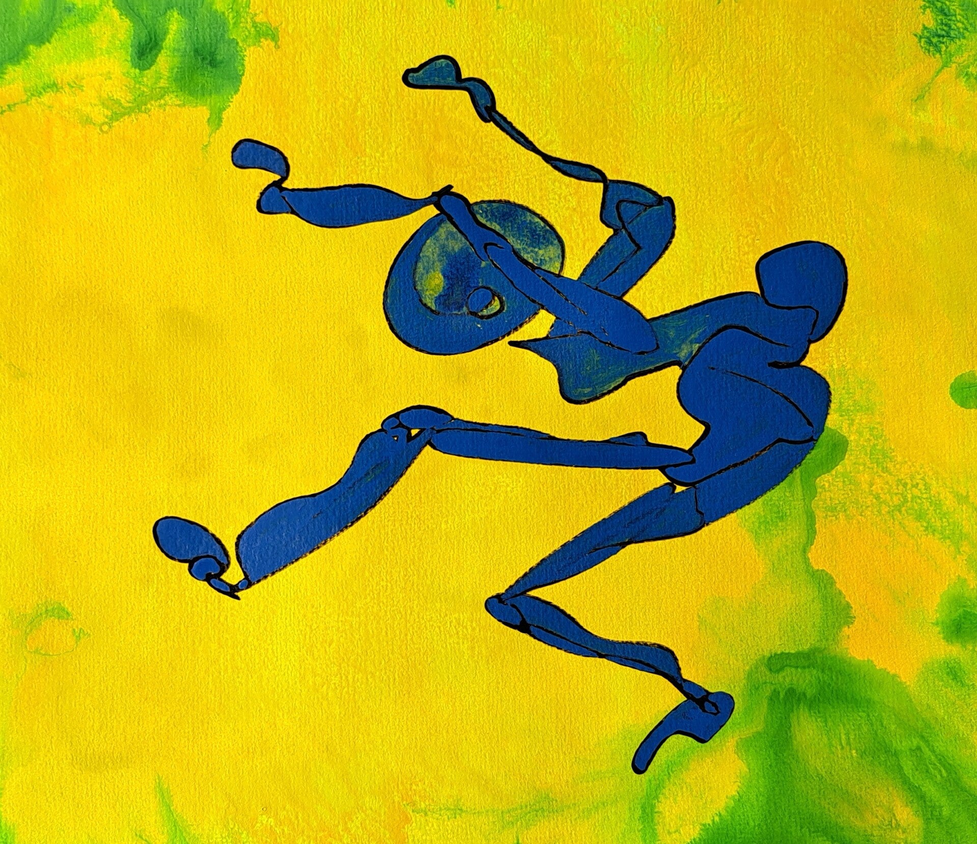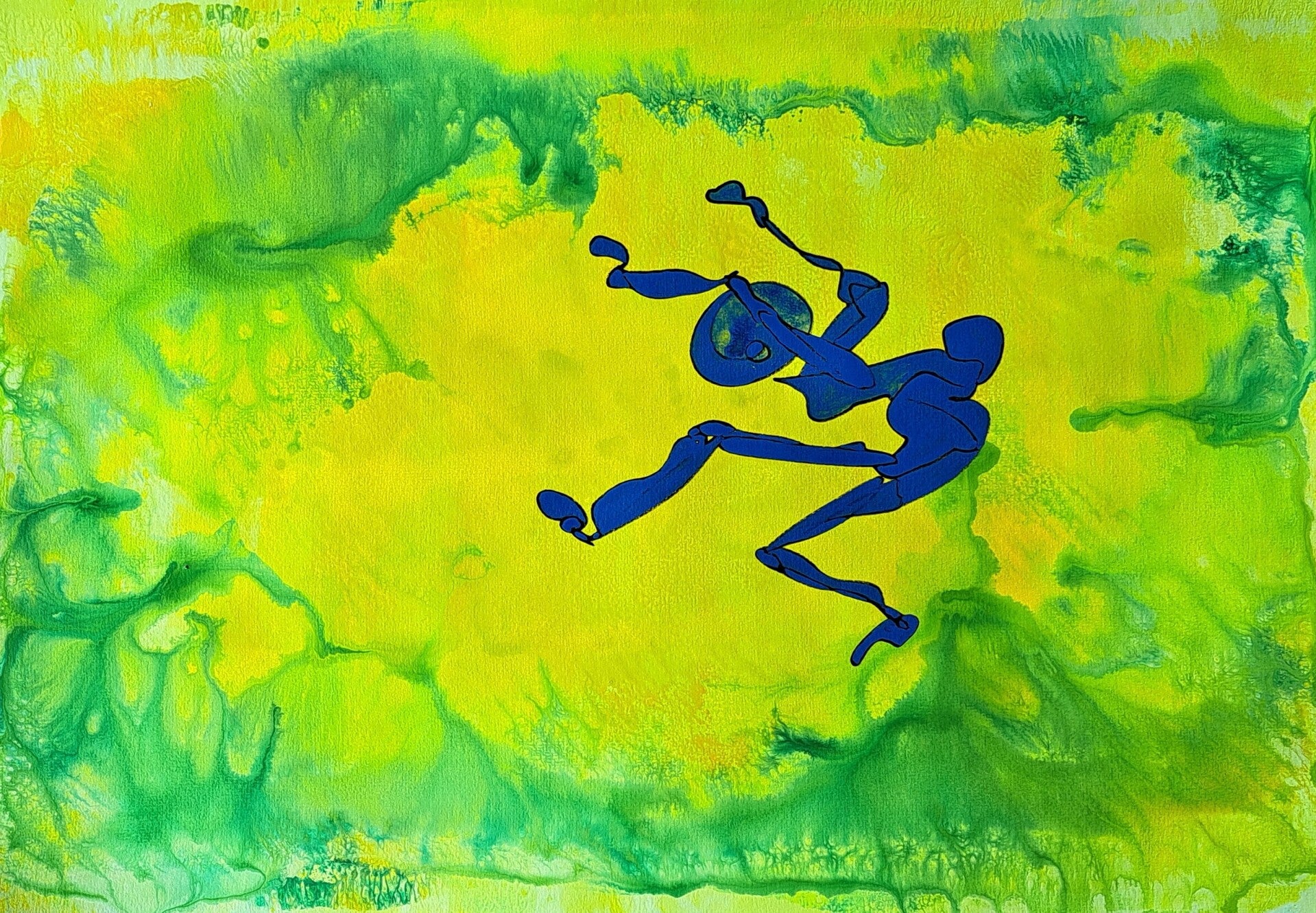 Achtergrond informatie: Met vloeibare acryl - inkt op acrylbasis (Golden high flow acrylics) is de achtergrond neergezet. Op basis wat de achtergrond toont, wordt de figuur spontaan in een paar halen neer gezet en (iets) ingekleurd.
