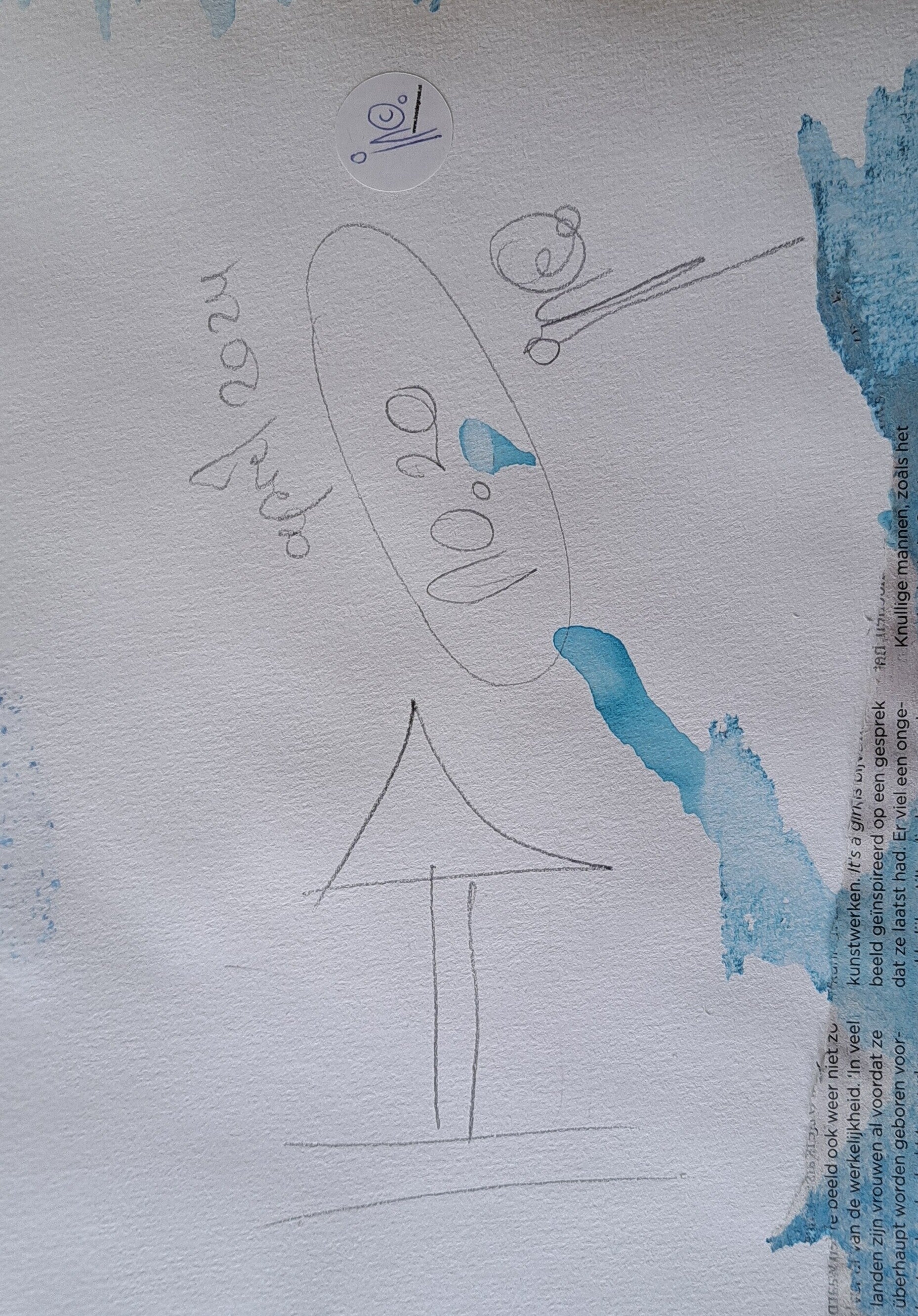 Achtergrond informatie: Met vloeibare acryl - inkt op acrylbasis (Golden high flow acrylics) is de achtergrond neergezet. Op basis wat de achtergrond toont, wordt de figuur spontaan in een paar halen neer gezet en (iets) ingekleurd.