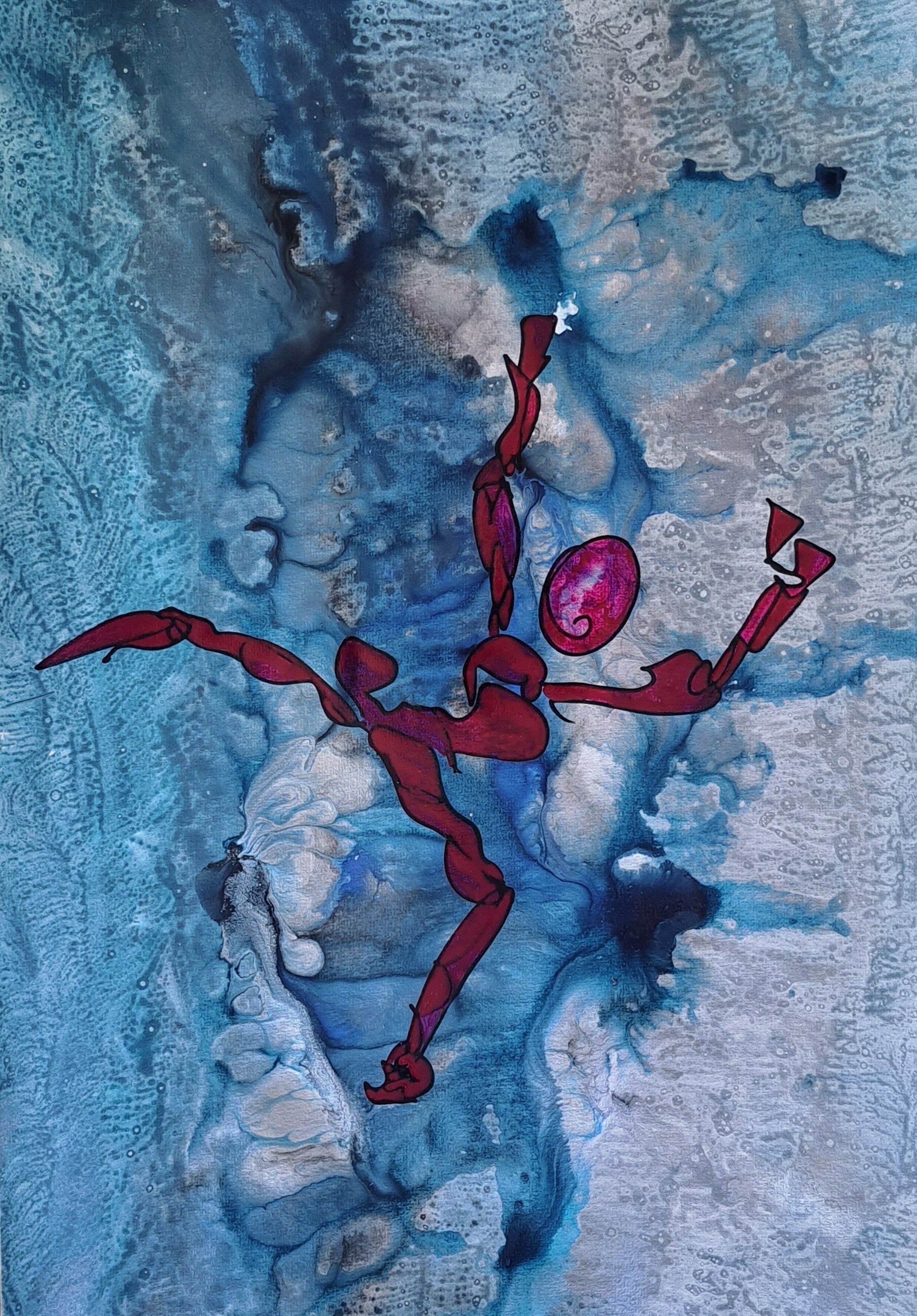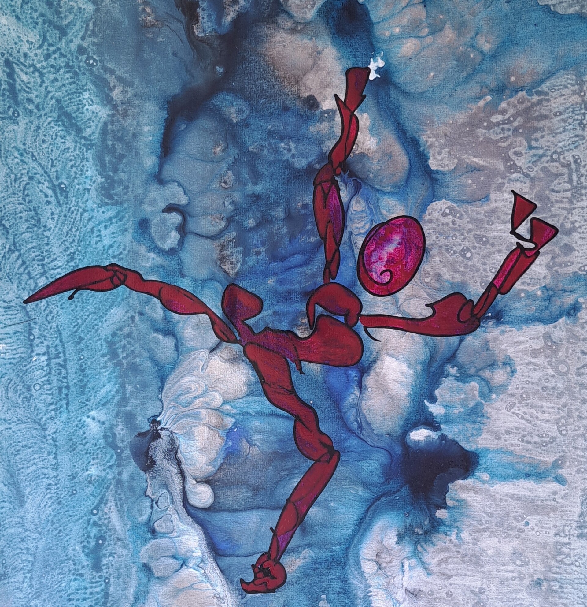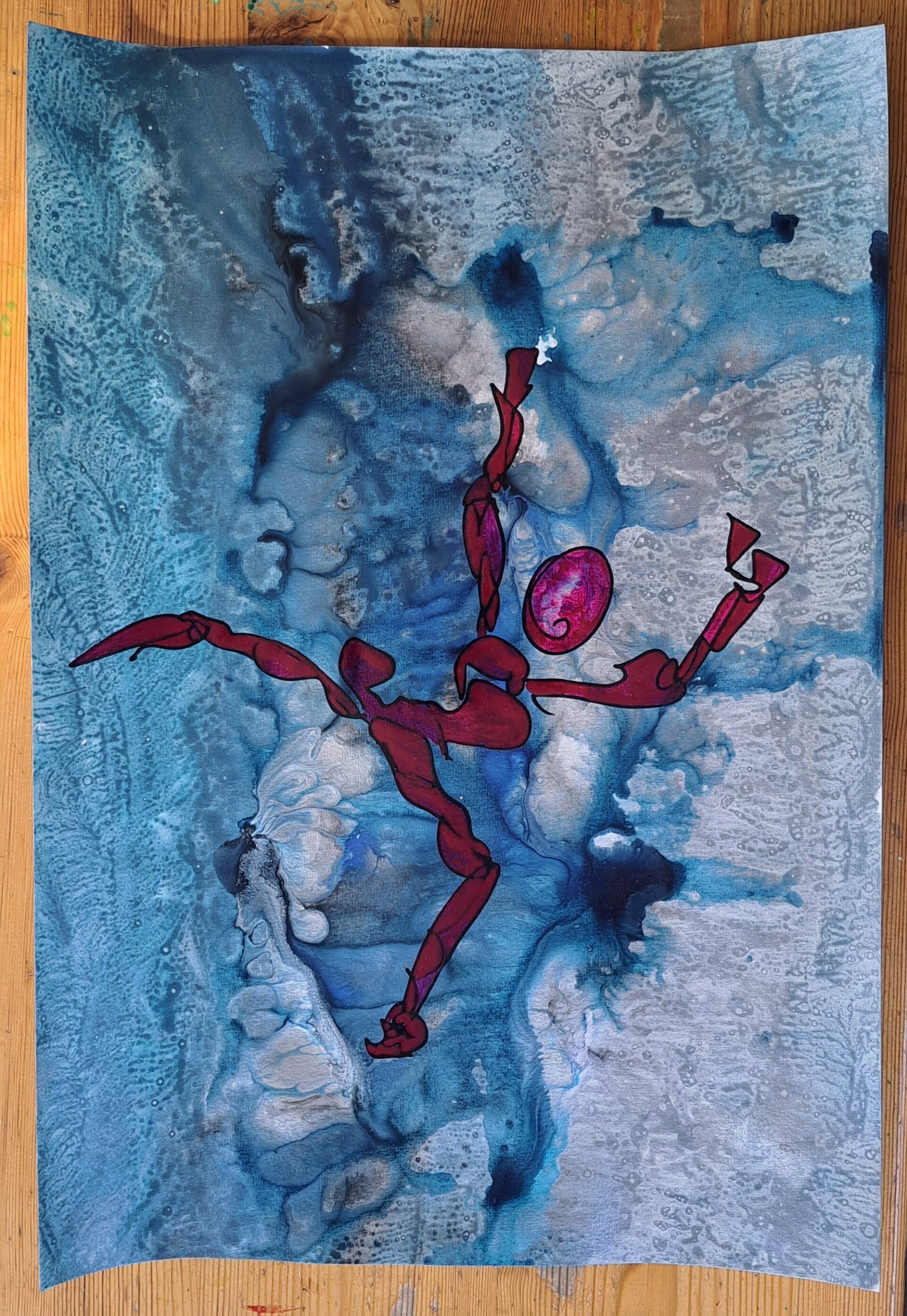 Achtergrond informatie: Met vloeibare acryl - inkt op acrylbasis (Golden high flow acrylics) is de achtergrond neergezet. Op basis wat de achtergrond toont, wordt de figuur spontaan in een paar halen neer gezet en (iets) ingekleurd.