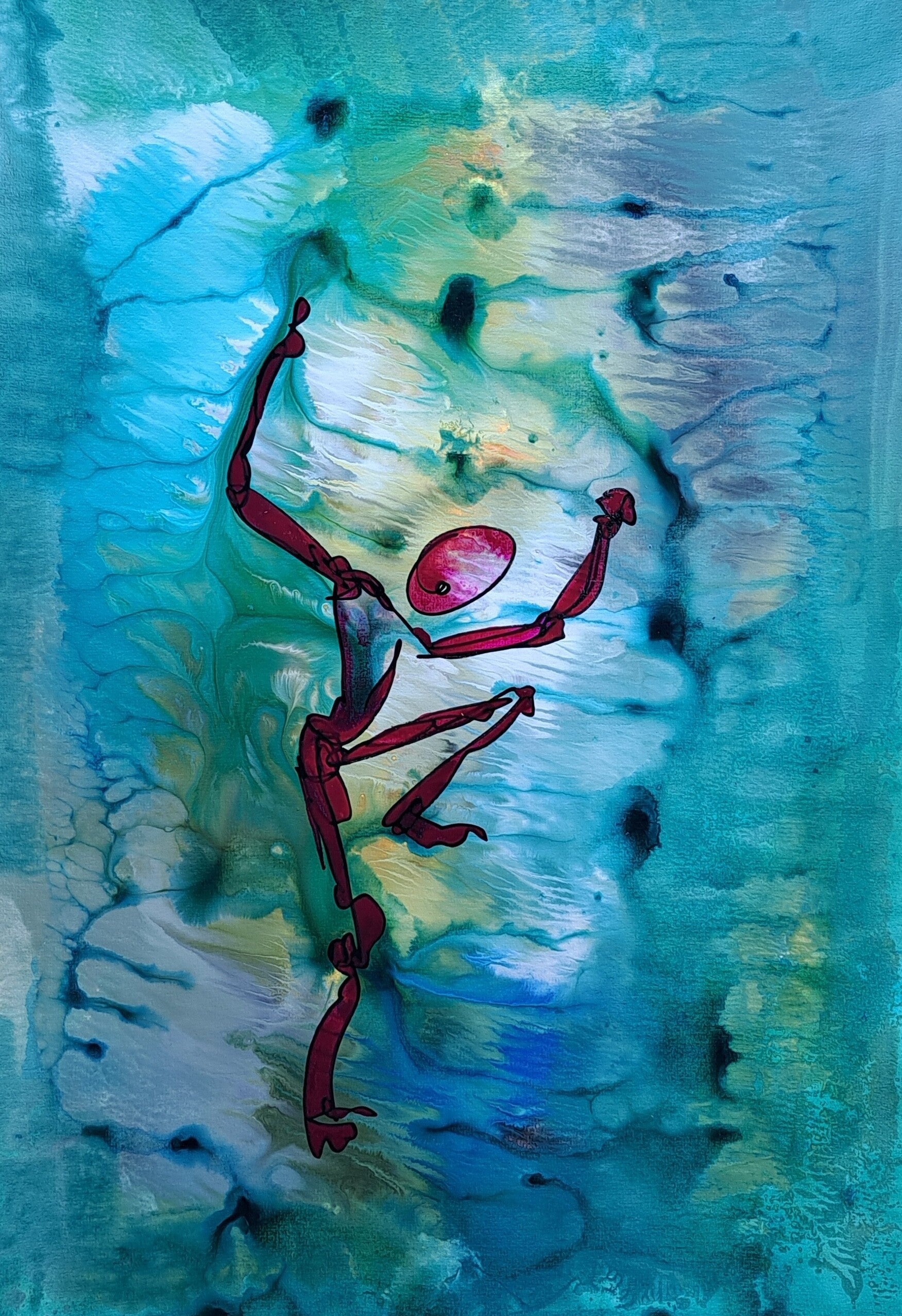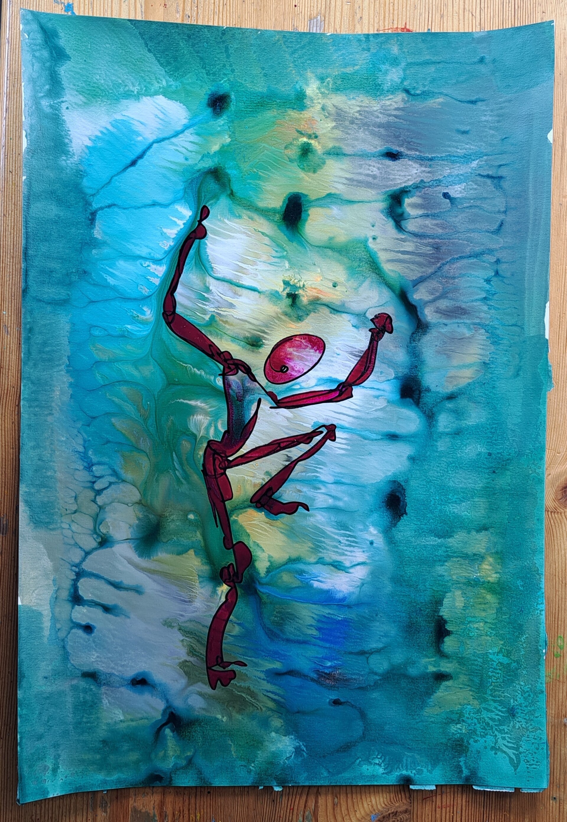 Achtergrond informatie: Met vloeibare acryl - inkt op acrylbasis (Golden high flow acrylics) is de achtergrond neergezet. Op basis wat de achtergrond toont, wordt de figuur spontaan in een paar halen neer gezet en (iets) ingekleurd.