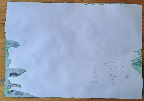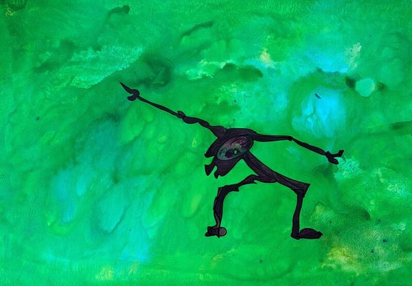 Achtergrond informatie: Met vloeibare acryl - inkt op acrylbasis (Golden high flow acrylics) is de achtergrond neergezet. Op basis wat de achtergrond toont, wordt de figuur spontaan in een paar halen neer gezet en (iets) ingekleurd.