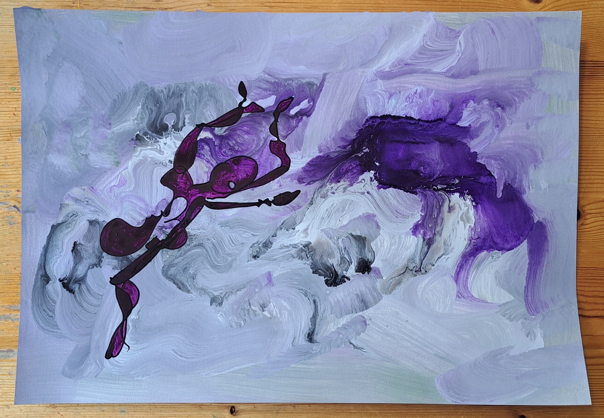 Achtergrond informatie: Met vloeibare acryl - inkt op acrylbasis (Golden high flow acrylics) is de achtergrond neergezet. Op basis wat de achtergrond toont, wordt de figuur spontaan in een paar halen neer gezet en (iets) ingekleurd.