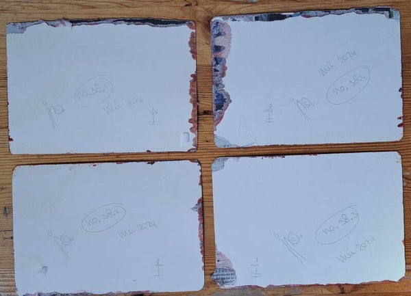 Foto's: geheel, de vier afzondelijk, achterkant met handtekening achterkant totaal.