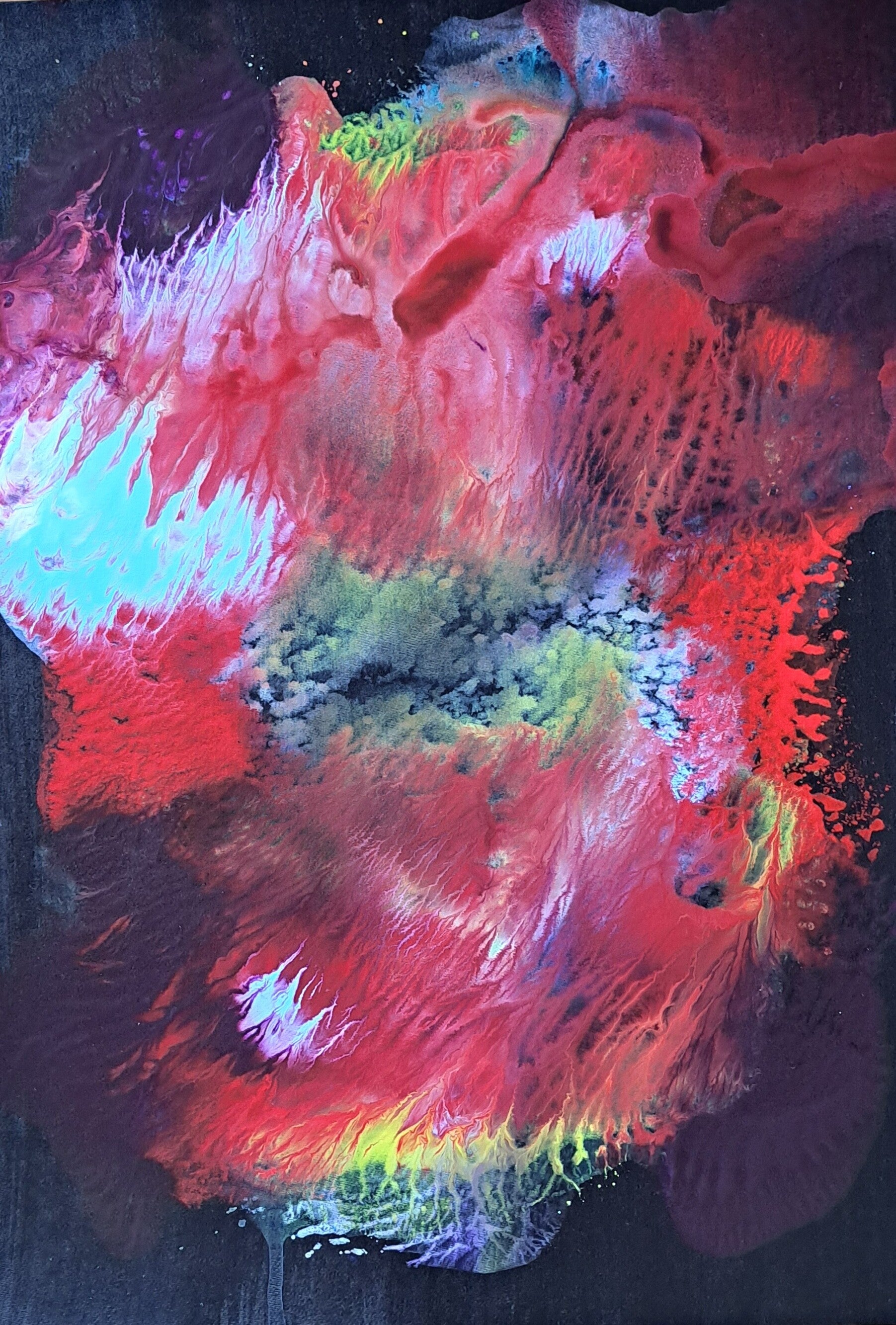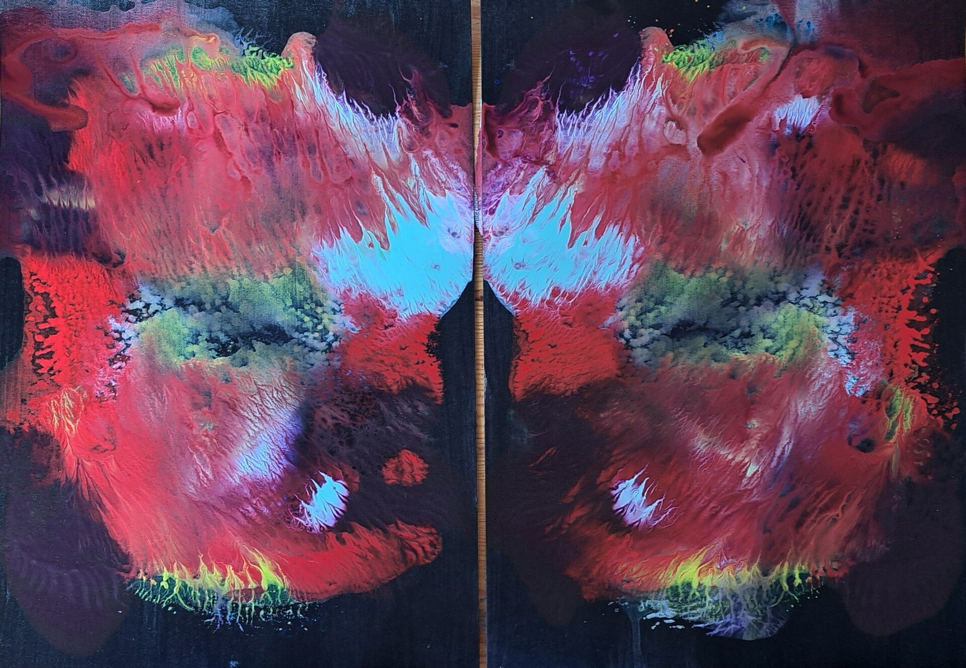 Achtergrond informatie: Het werk is geschilderd met vloeibare acryl - inkt op acrylbasis (Golden high flow acrylics) op schilderkarton2, formaat een werk ca. 42X30 cm. (naast elkaar ca. 42x60)