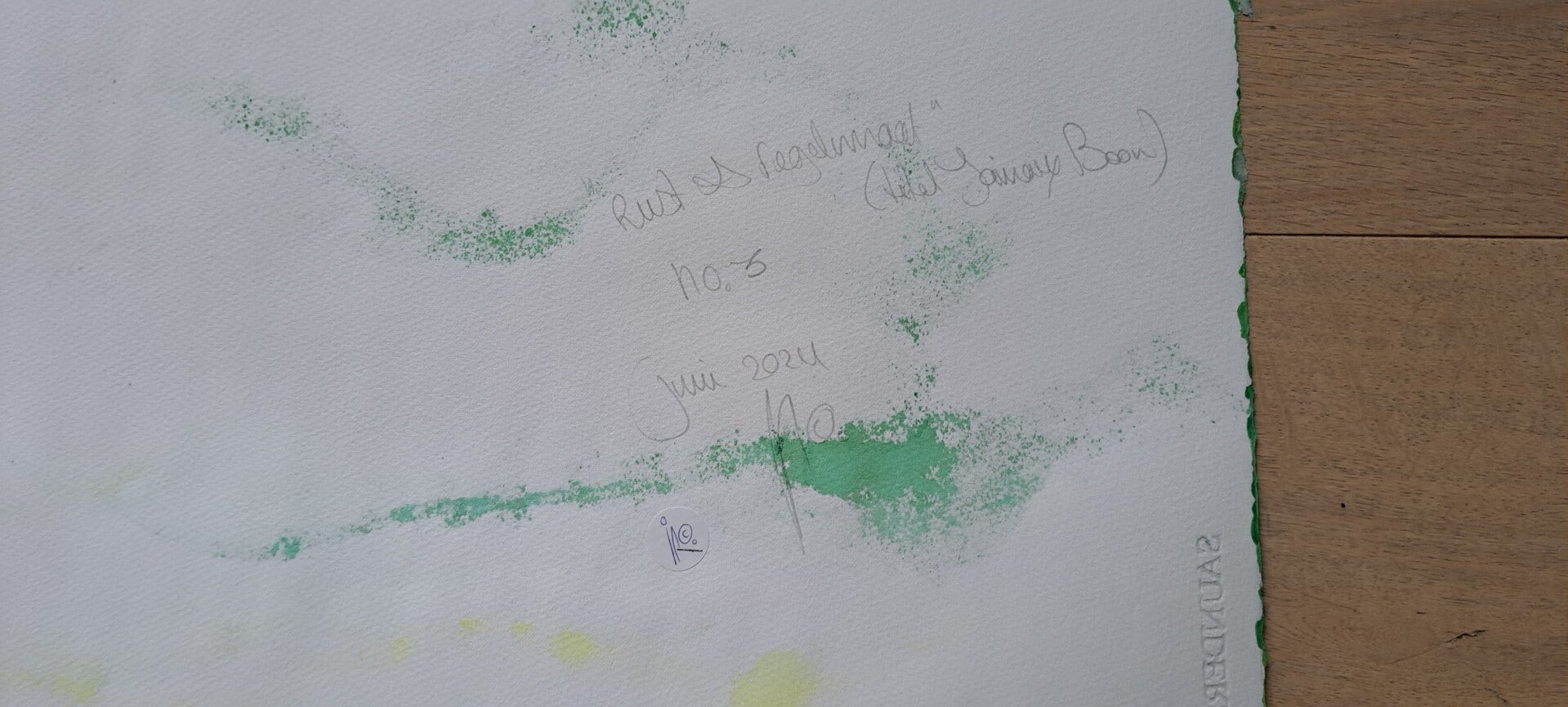 'Fragmenten van vergeten herinneringen' no 1, 'Rust en regelmaat'. Tijdens het schilderen tonen zich flarden van herinneringen. Herinneringen zijn voor mij meestal sferen. Woorden koppelen aan sferen is vaak lastig. Jaimary Boon (vriendin en kunstenaares) gaf het meeste werk titels. Zij keek naar mijn werk en reageerde direct.