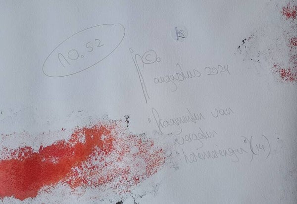 'Fragmenten van vergeten herinneringen' no 52, zonder titel 14. Tijdens het schilderen tonen zich flarden van herinneringen. 'Doorgangen' zijn voor mij poorten naar andere werelden, andere sferen. Er zijn honderd manieren om van de ene naar de andere over te gaan. Flarden van wat ik tegen kwam. Woorden koppelen aan sferen is vaak lastig. Geef alsjeblieft jouw eigen invulling.