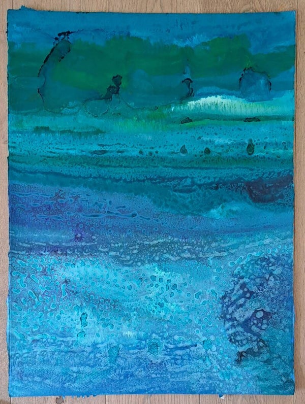 Achtergrond informatie: Het werk is geschilderd met vloeibare acryl - inkt (Golden high flow acrylics) op Saunders Waterford papier, 190 gram per vierkante meter, formaat een werk 56X76 cm.