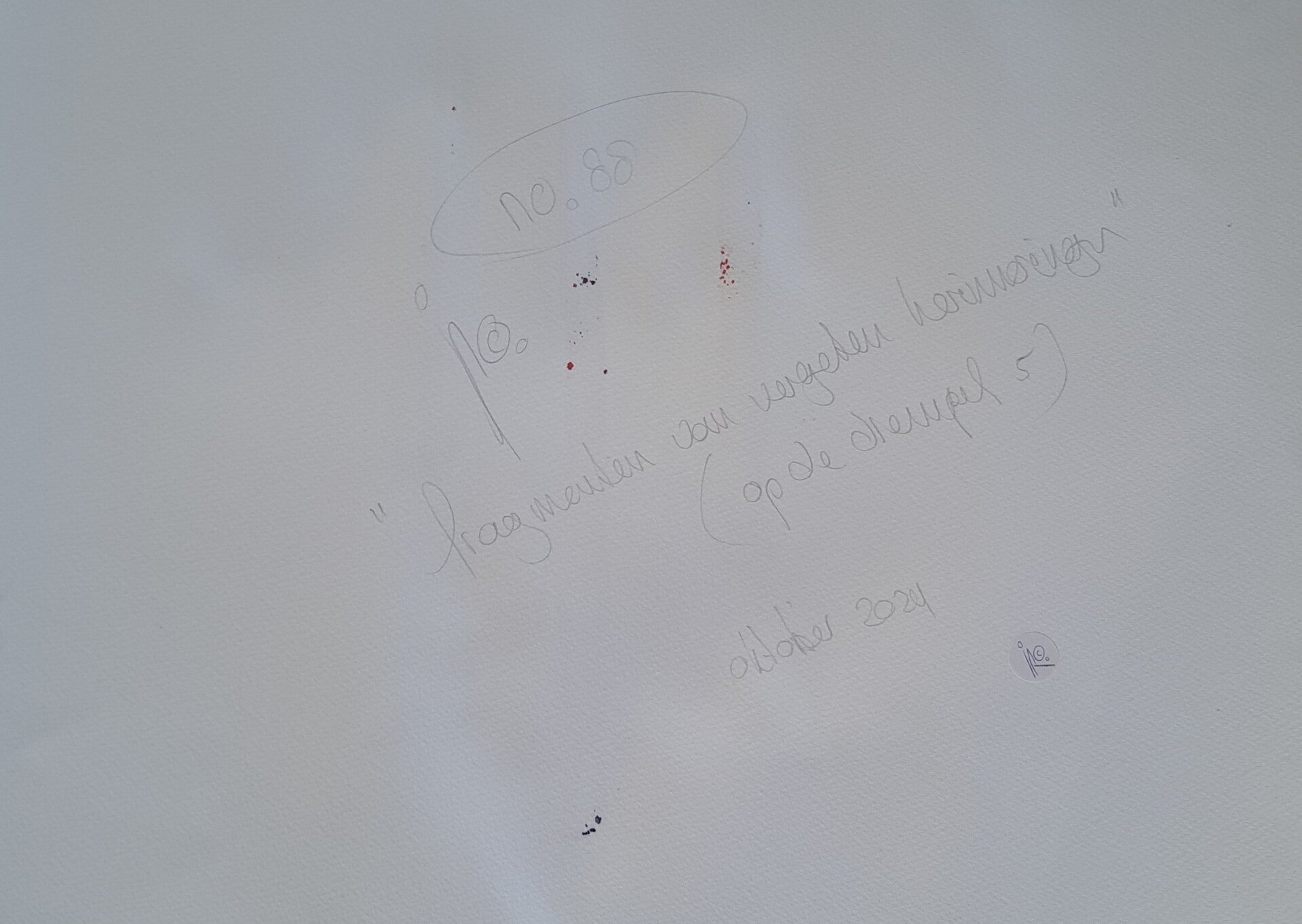 'Fragmenten van vergeten herinneringen' no 88, 'Op de drempel 5'. Het werk toont flarden van herinneringen. Flarden zijn per definitie incompleet. Mijn herinnering is een deuropening waar mensen, schimmen, geesten, energieën doorgaan van de ene naar de andere kant. Dit werk nav 11 oktober, de dag van uit de kast komen' eerste van vier. Geef alsjeblieft jouw eigen invulling.