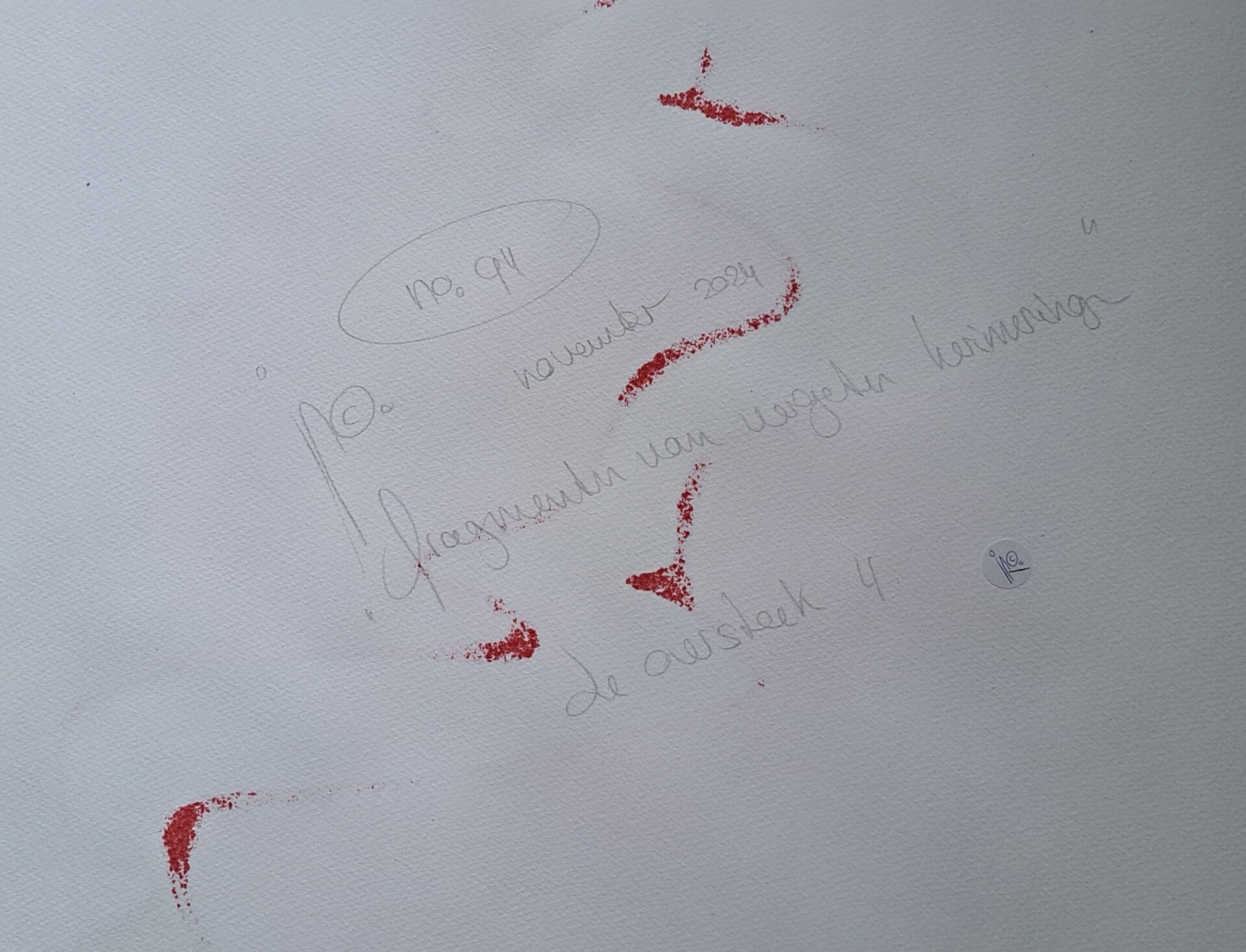 'Fragmenten van vergeten herinneringen' no 94, 'De oversteek 4'. Het werk toont flarden van herinneringen. Flarden zijn per definitie incompleet. Mijn herinnering is het obstakel dat genomen moet worden, over gestoken, over gevaren, de veerman mioet betaald wrden dus zorg dat je geld bij je hebt.