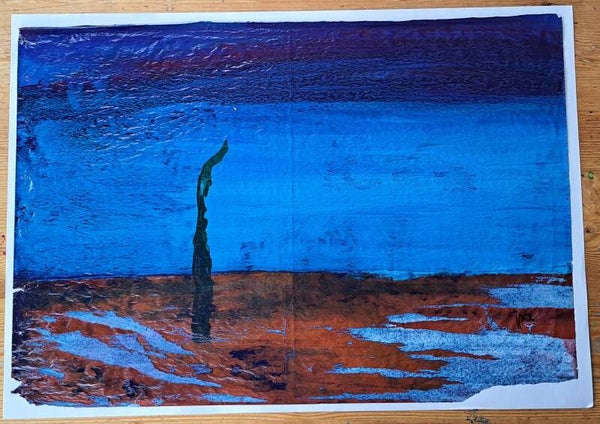Het schilderij 'Volkskrant', 'Alleen'. Het noodlot slaat toe. Wat overblijft is de stam. Heeft de stam nog genoeg levenskracht om opnieuw te beginnen? Zijn de seizoenen vriendelijk genoeg? Of is de kern geraakt en blijft over dood hout als baken wat er was?