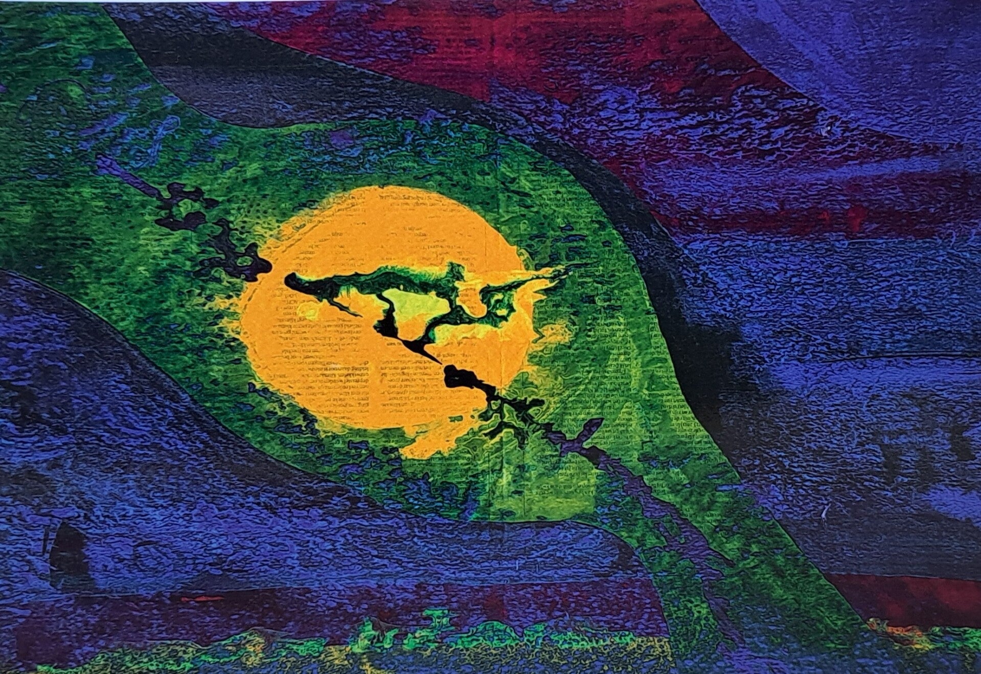 Het originele werk is met inkt op acrylbasis (Golden high flow acrylics) geschilderd op gebruikt krantenpapier (dubbele pagina Volkskrant). De letters, tekeningen en/of foto's van de krant schemeren door de inkt, dit geeft een unieke betekenislaag die meer of minder het uiteindelijke beeld bepaalt.